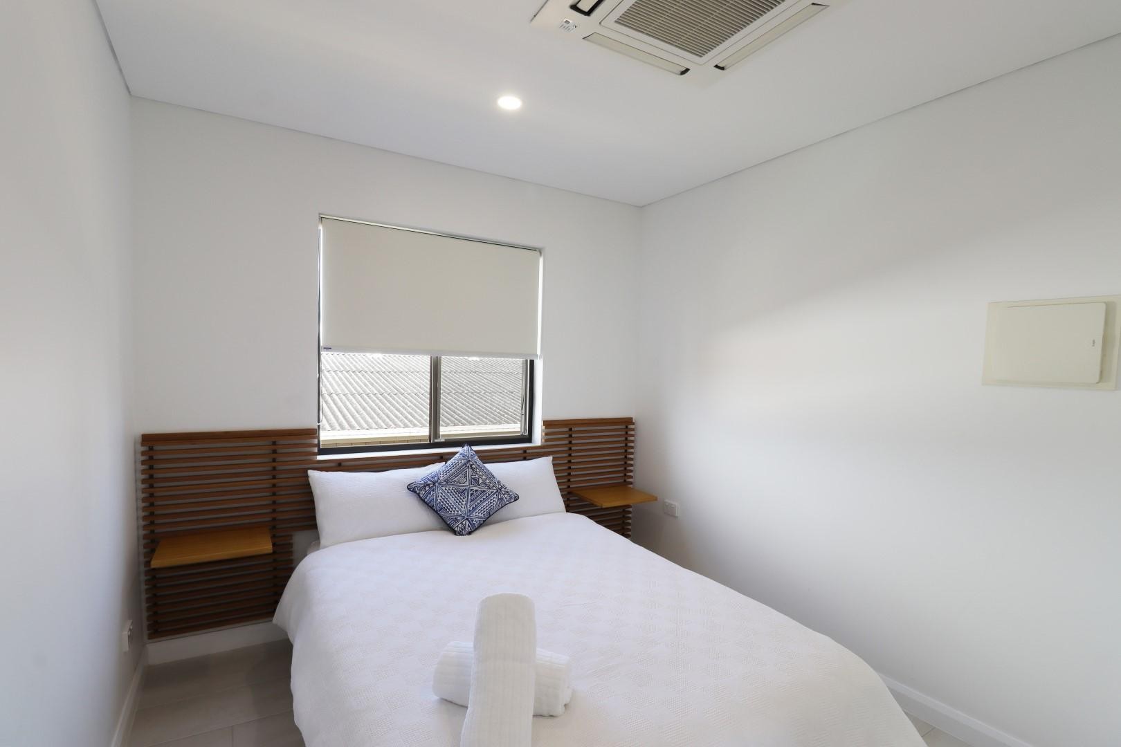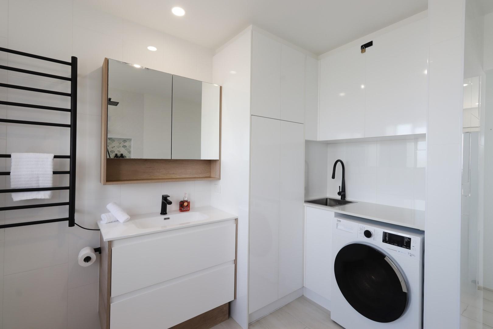 Both bedrooms are generously sized and include built-in cabinetry and ducted air conditioning for year-round comfort. The spacious bathroom incorporates a dedicated laundry area complete with a washer/dryer for added convenience.