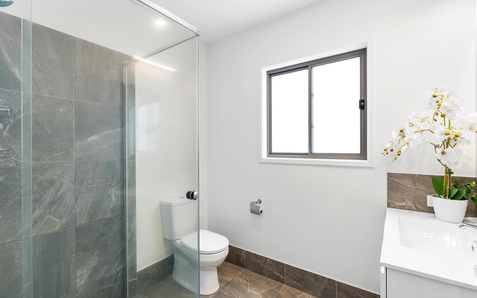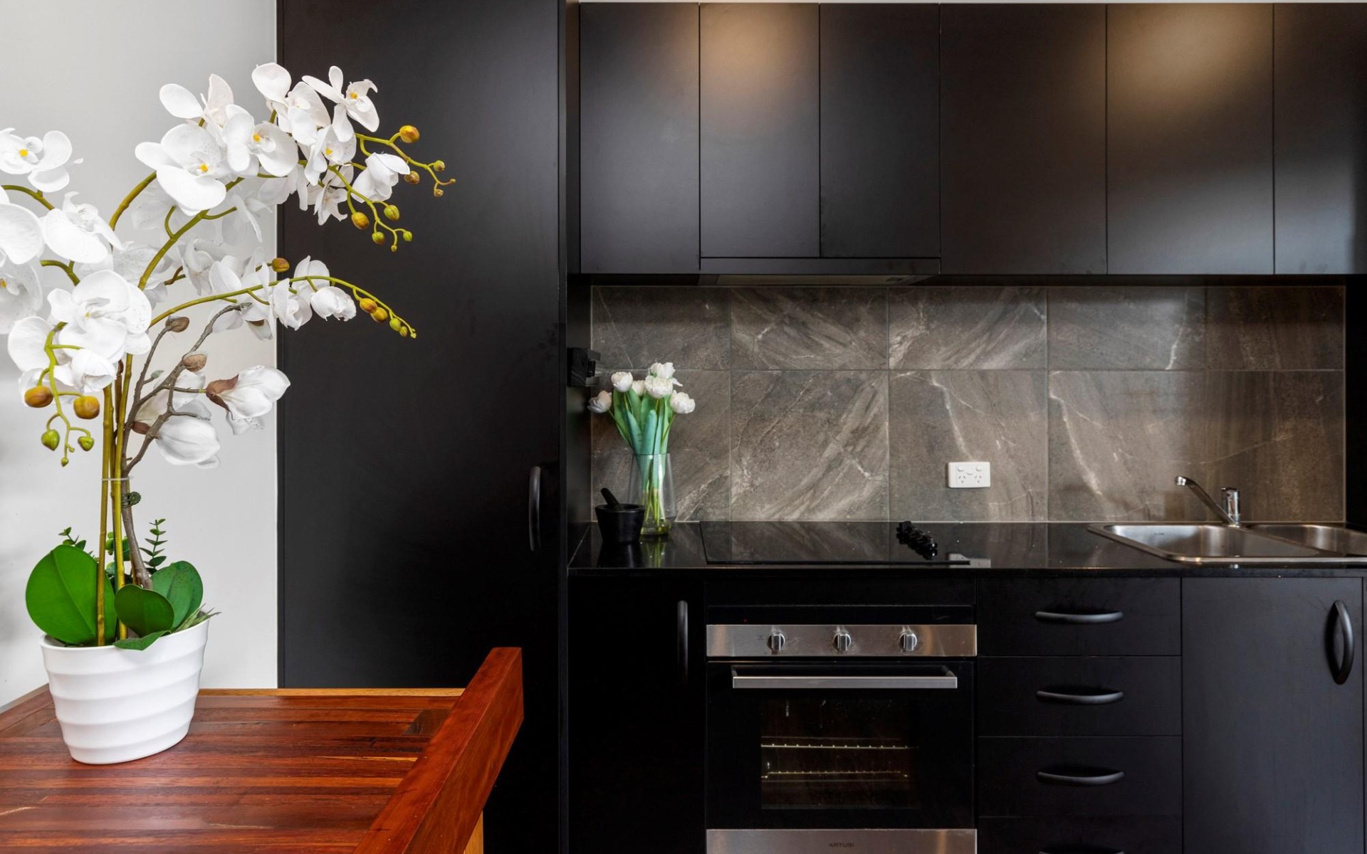 - Kitchen with stone benchtop and ample storage