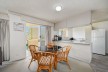 The functional kitchen includes ample storage and workspace, along with a dishwasher for added convenience. Adjacent dining space provides a practical setting for everyday meals.