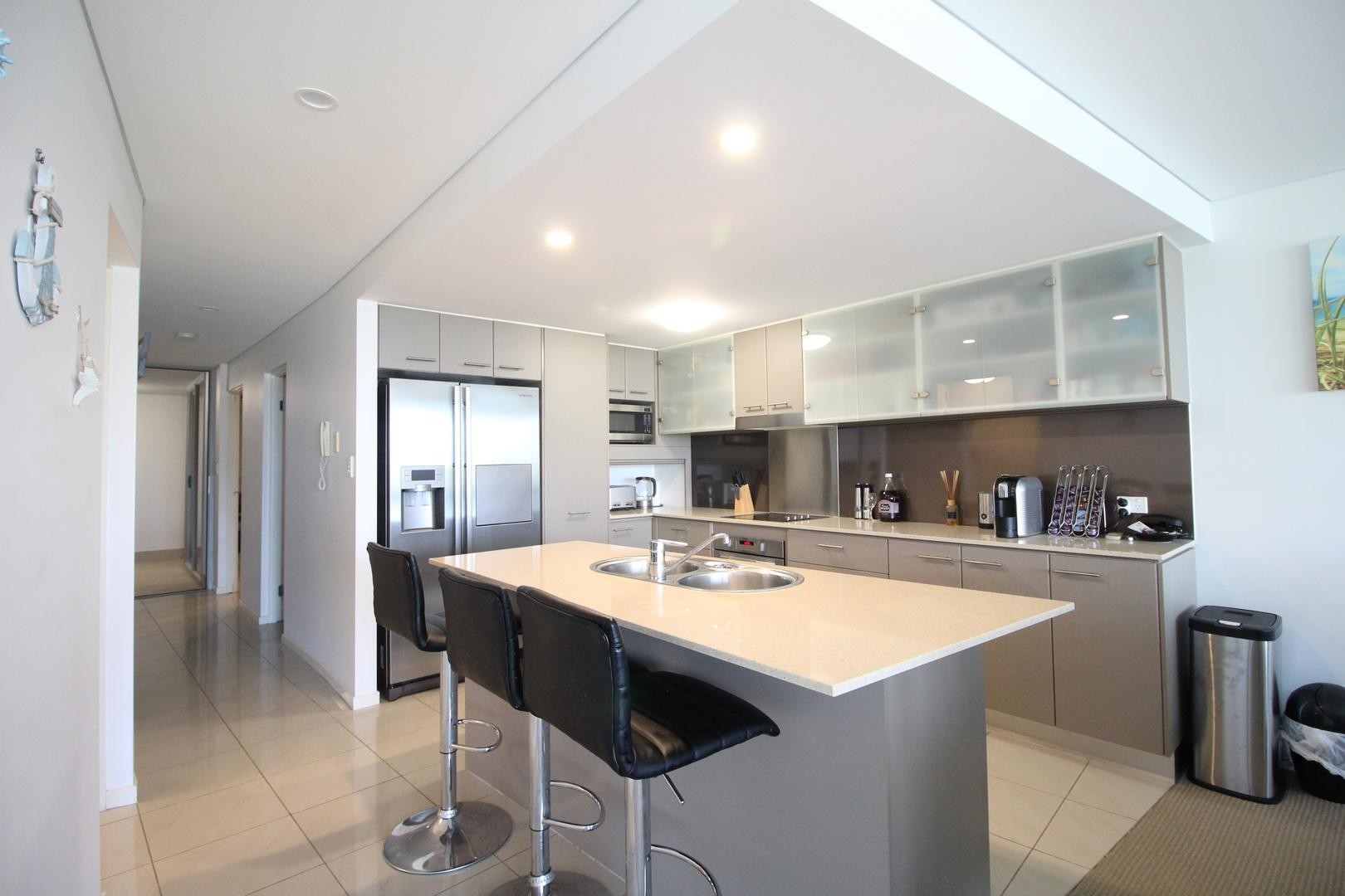 - Large kitchen with stone benchtops and ample cupboard space