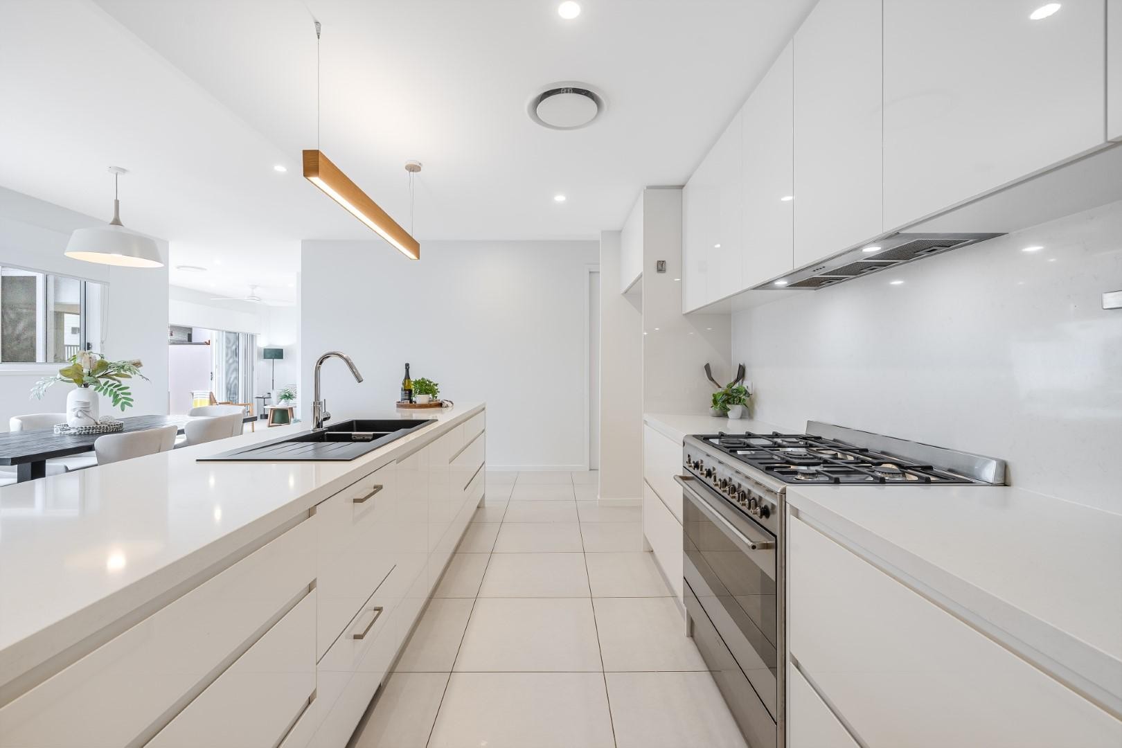 The designer kitchen is a standout, featuring stone benchtops, a large walk-in pantry, five-burner gas cooktop, 900mm oven, and dual dishwashers.
