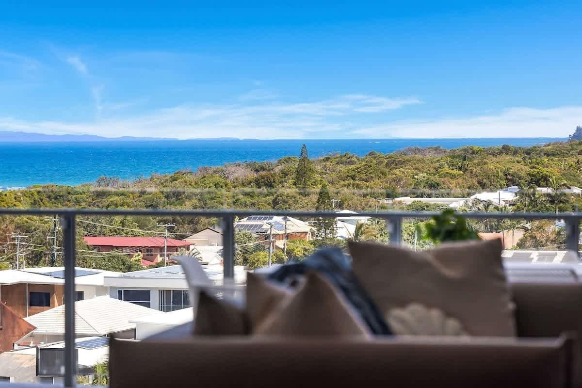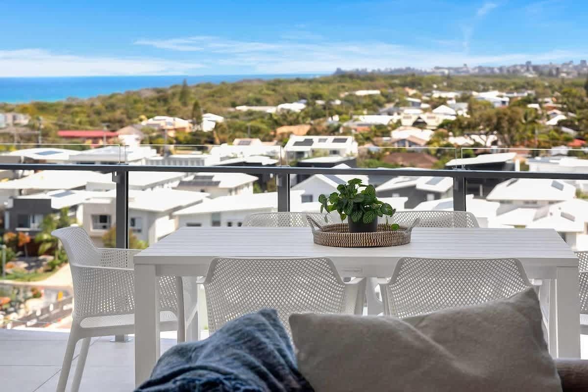 The light-filled open plan living and dining areas capture an abundance of natural light and flow seamlessly to a private balcony, accentuated by elevated balcony ceilings which offer an impressive sense of scale. Spectacular 180 degree views from the Glass House Mountains to Moffat Beach and Moreton Island, create the perfect space to relax or entertain.