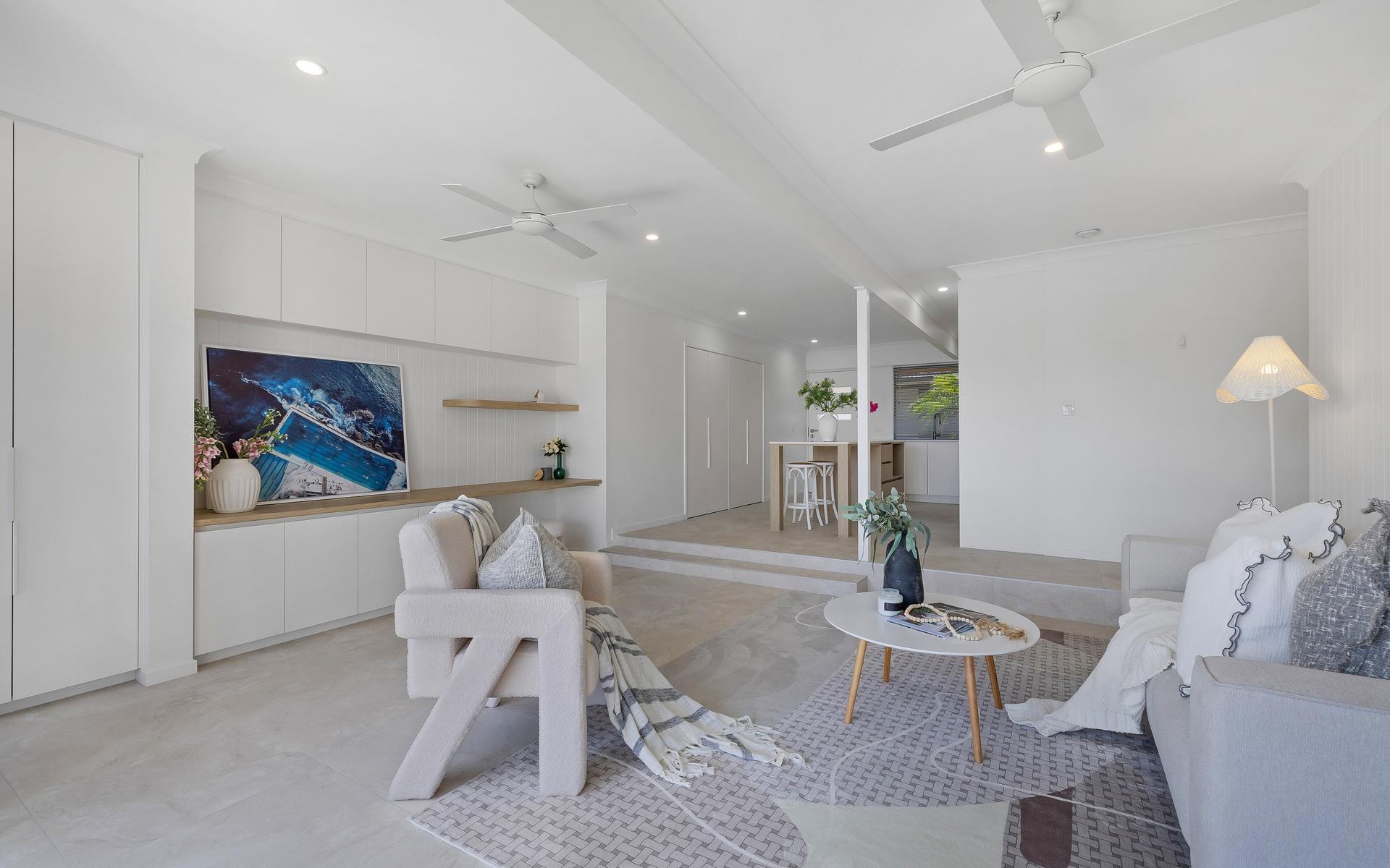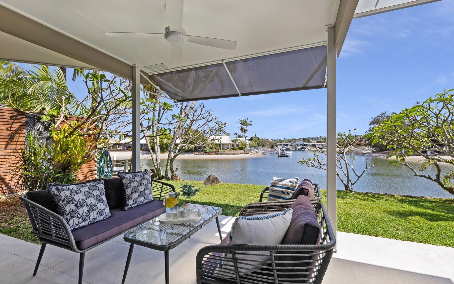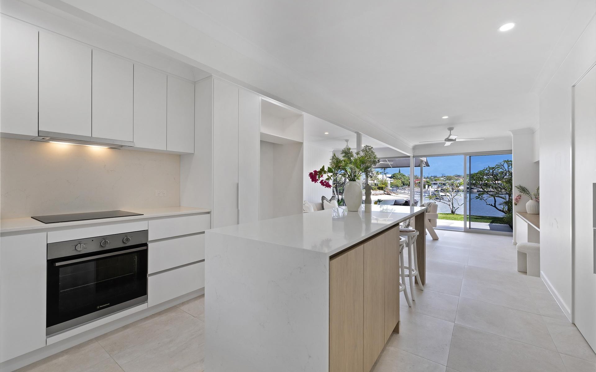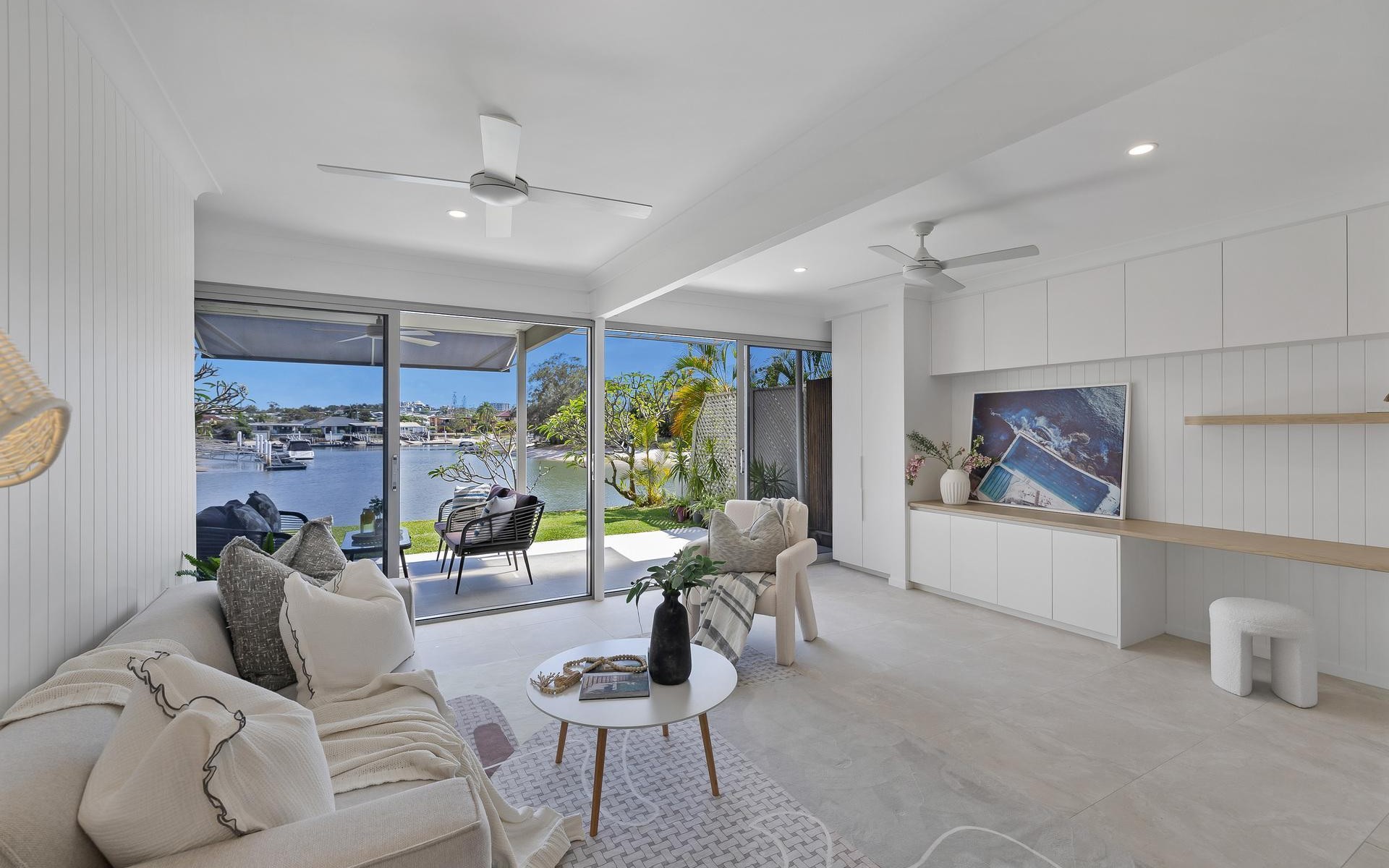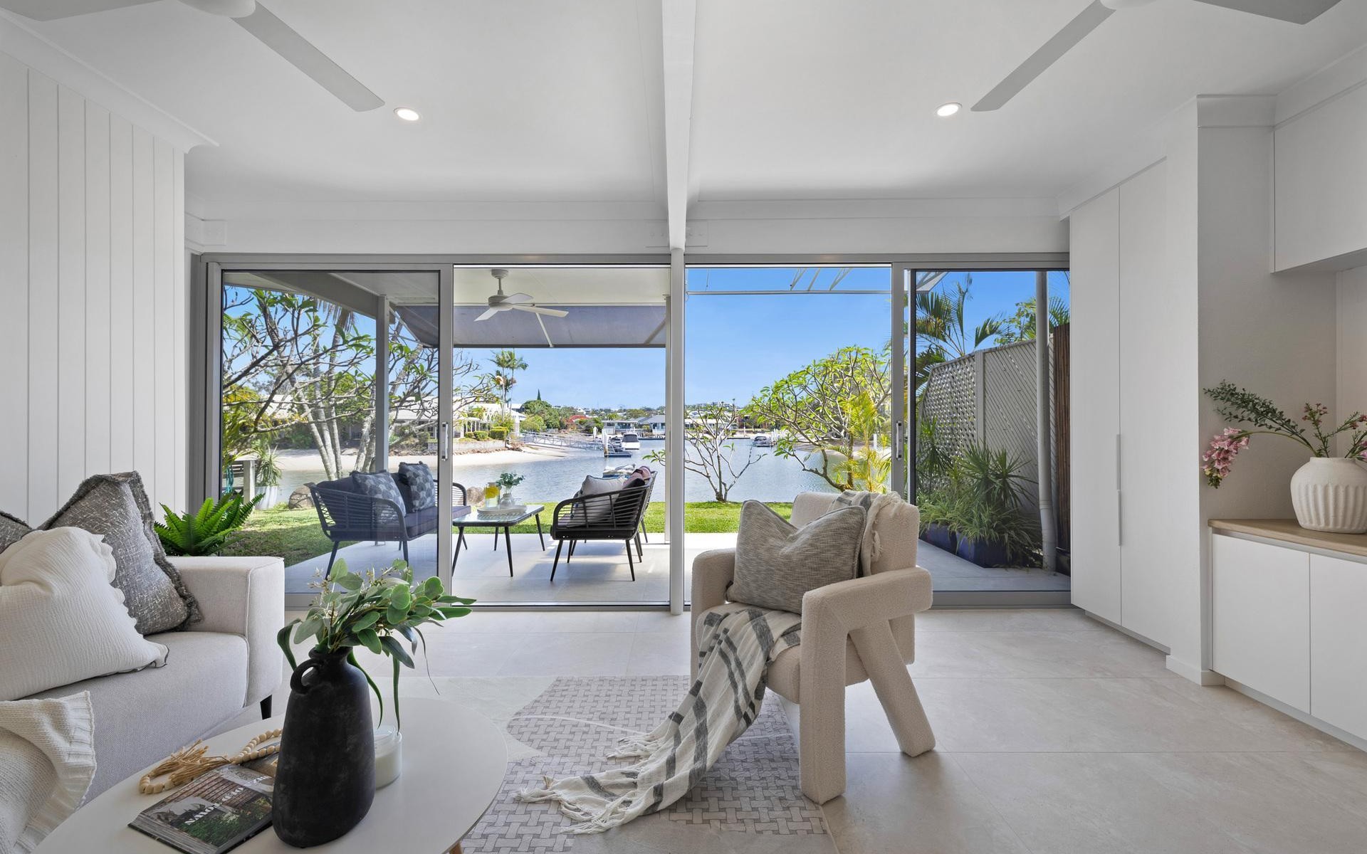 Step inside and you're greeted by a bright, open-plan layout framed by soft coastal tones, premium finishes and beautiful textures throughout. The living and dining area flows to a private outdoor alfresco, the perfect place to relax or entertain while overlooking the long, north-facing canal view.