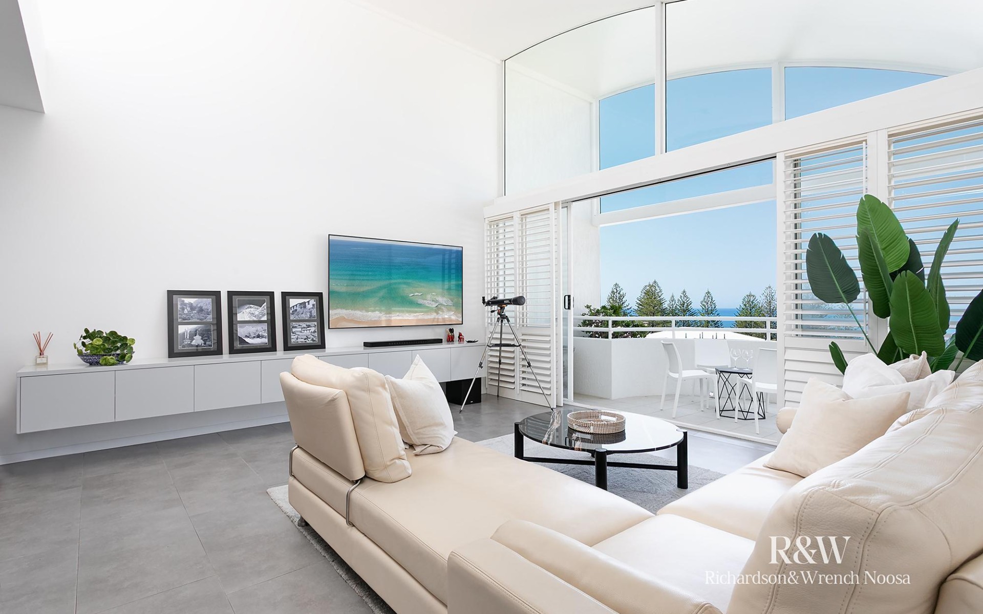 By mid-morning, you're on your expansive ocean-facing balcony, where floor-to-ceiling sliding glass doors have transformed your light-filled living area into one continuous indoor-outdoor space beneath soaring curved ceilings. The sea breeze drifts through as you catch up on emails or simply watch the waves roll in.