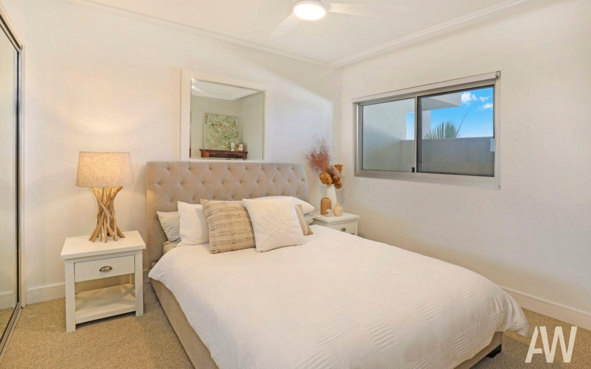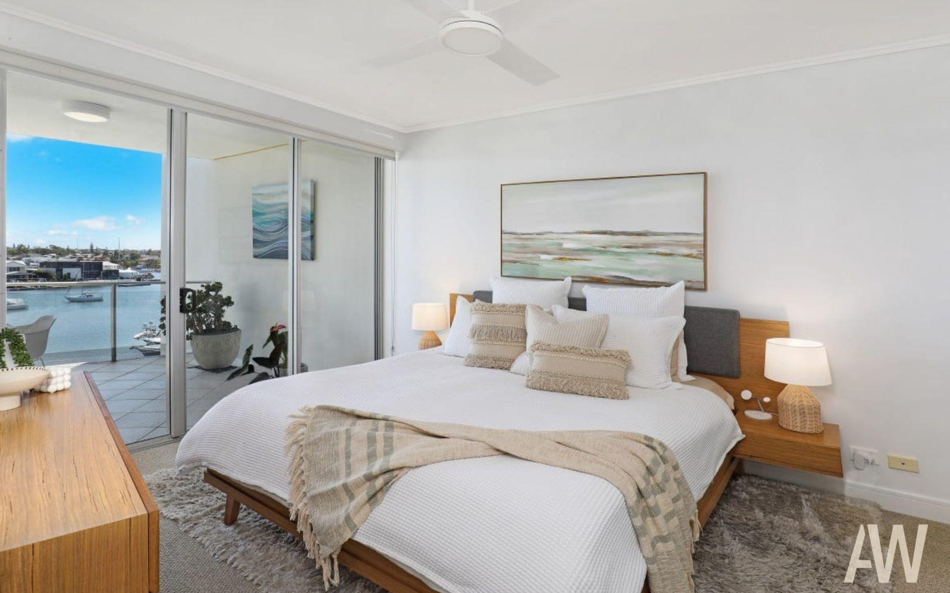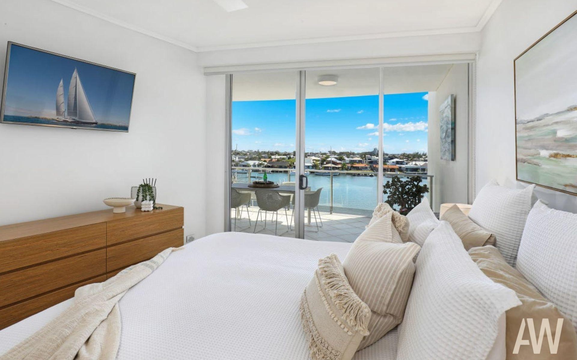 The main, ensuited bedroom opens directly onto the balcony, allowing you to wake up to tranquil water views every day. Two additional spacious bedrooms with built-in robes share the main bathroom, offering comfort and privacy for family and guests.