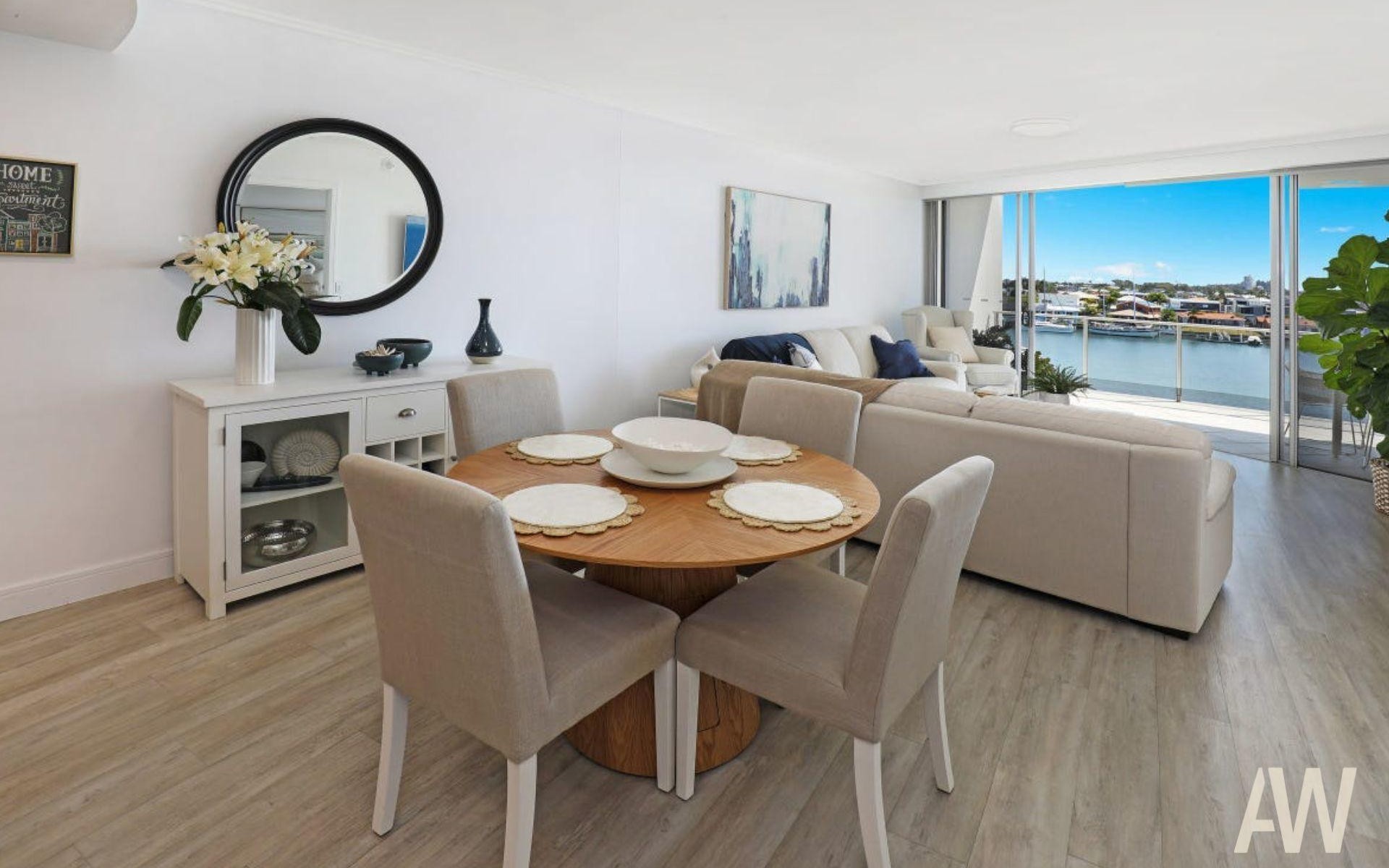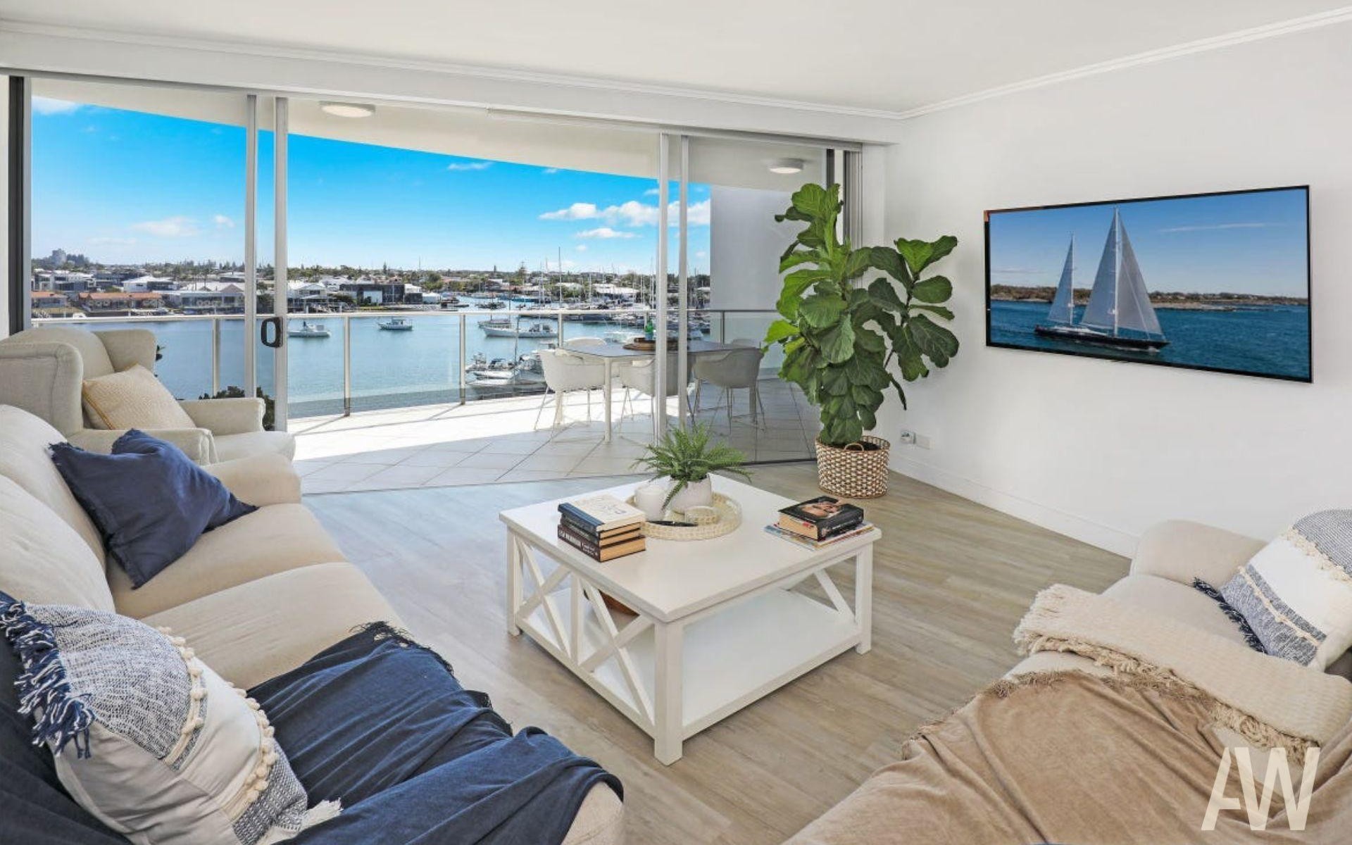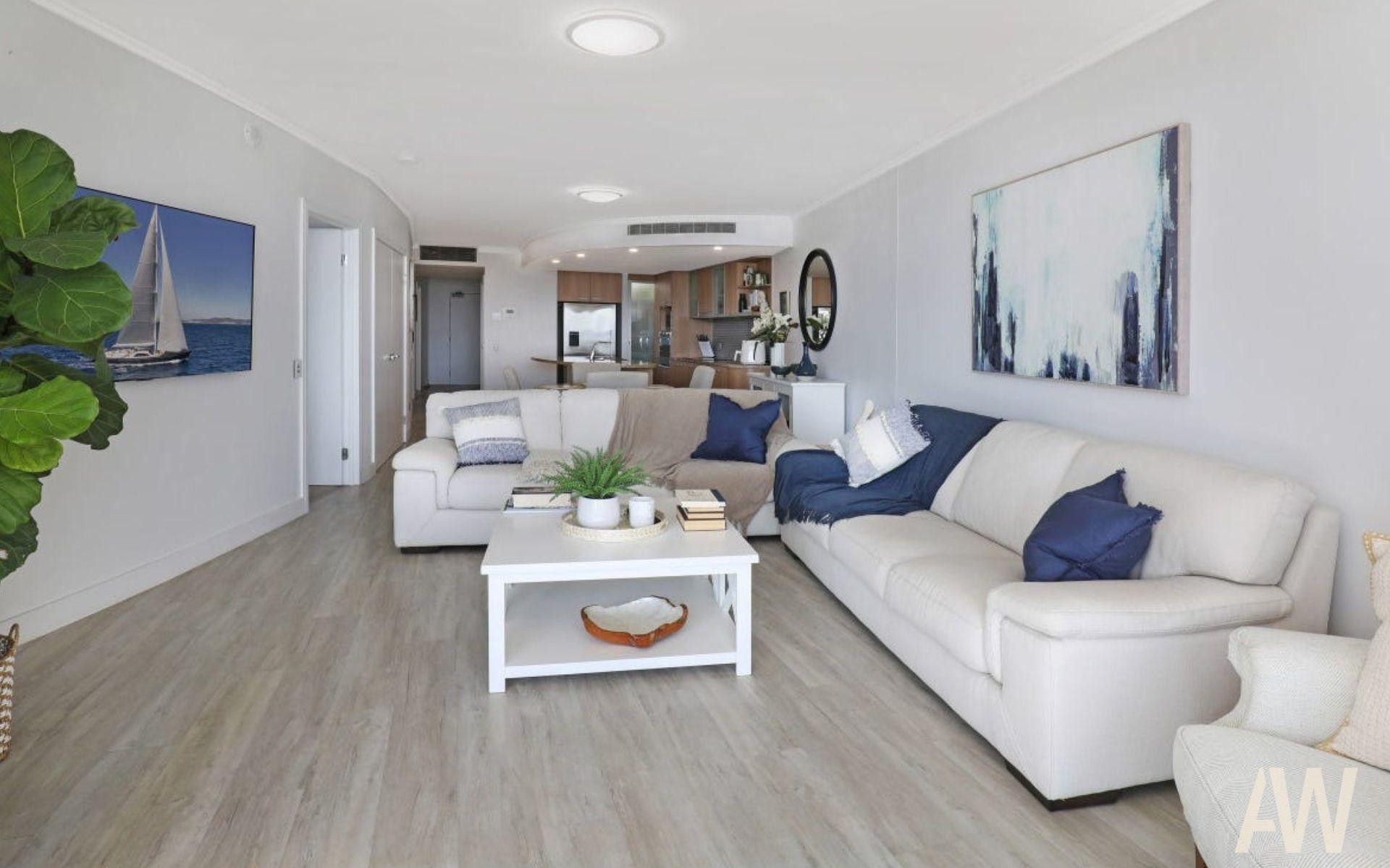 Step into this luxurious penthouse apartment and immediately feel the serene waterfront atmosphere. Bathed in natural light, this property offers an open-plan layout that seamlessly connects the living, dining, and kitchen areas, all designed with effortless coastal elegance.