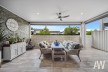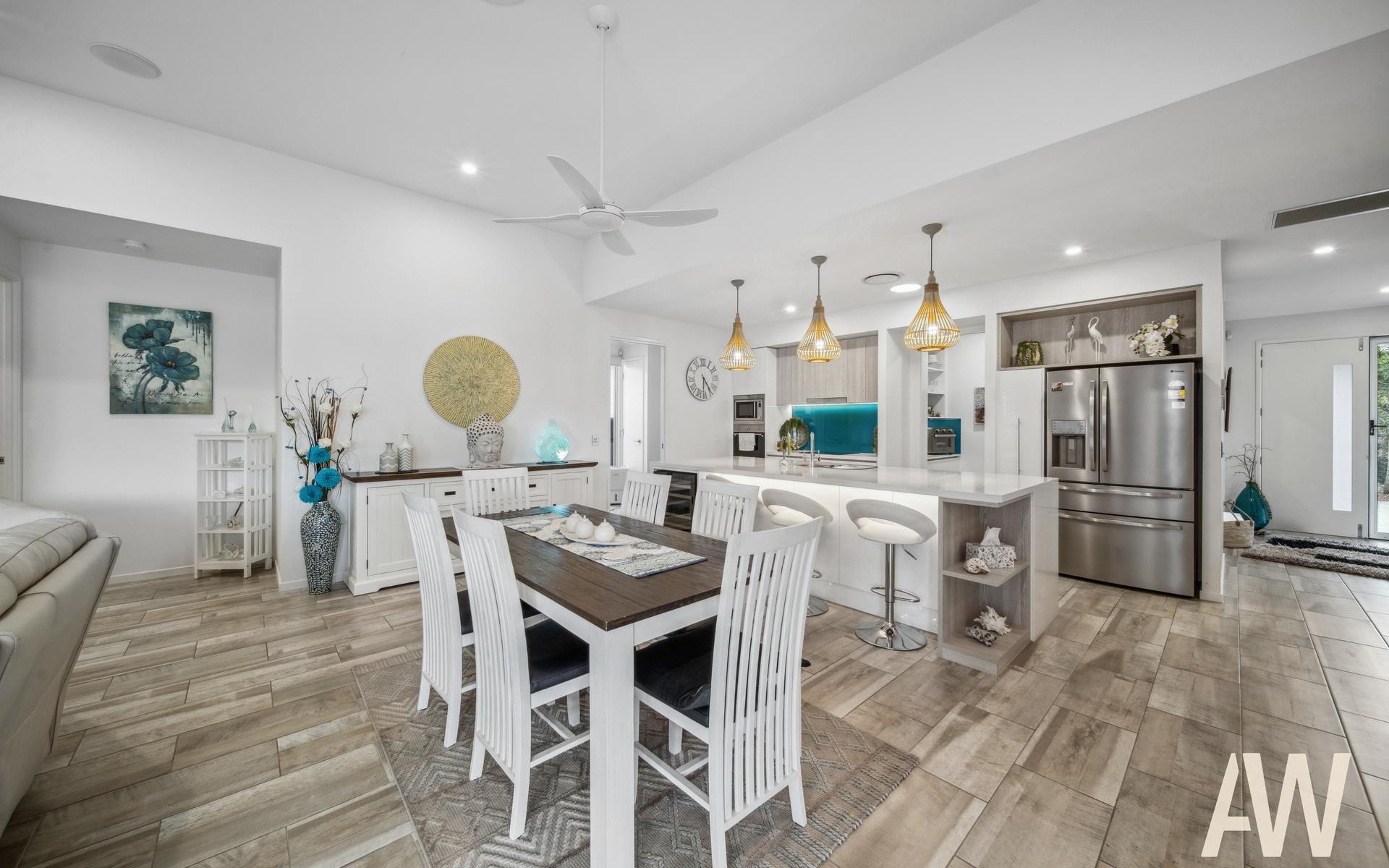 Upon entry, one is greeted by the expansive open-plan living and dining area, seamlessly connecting to a covered alfresco patio, perfect for unwinding or entertaining guests. The high-quality kitchen with stone benches and stainless steel appliances, including a wine fridge, caters to the epicurean enthusiast, while a walk-in pantry and soft close cabinetry enhance the culinary experience.