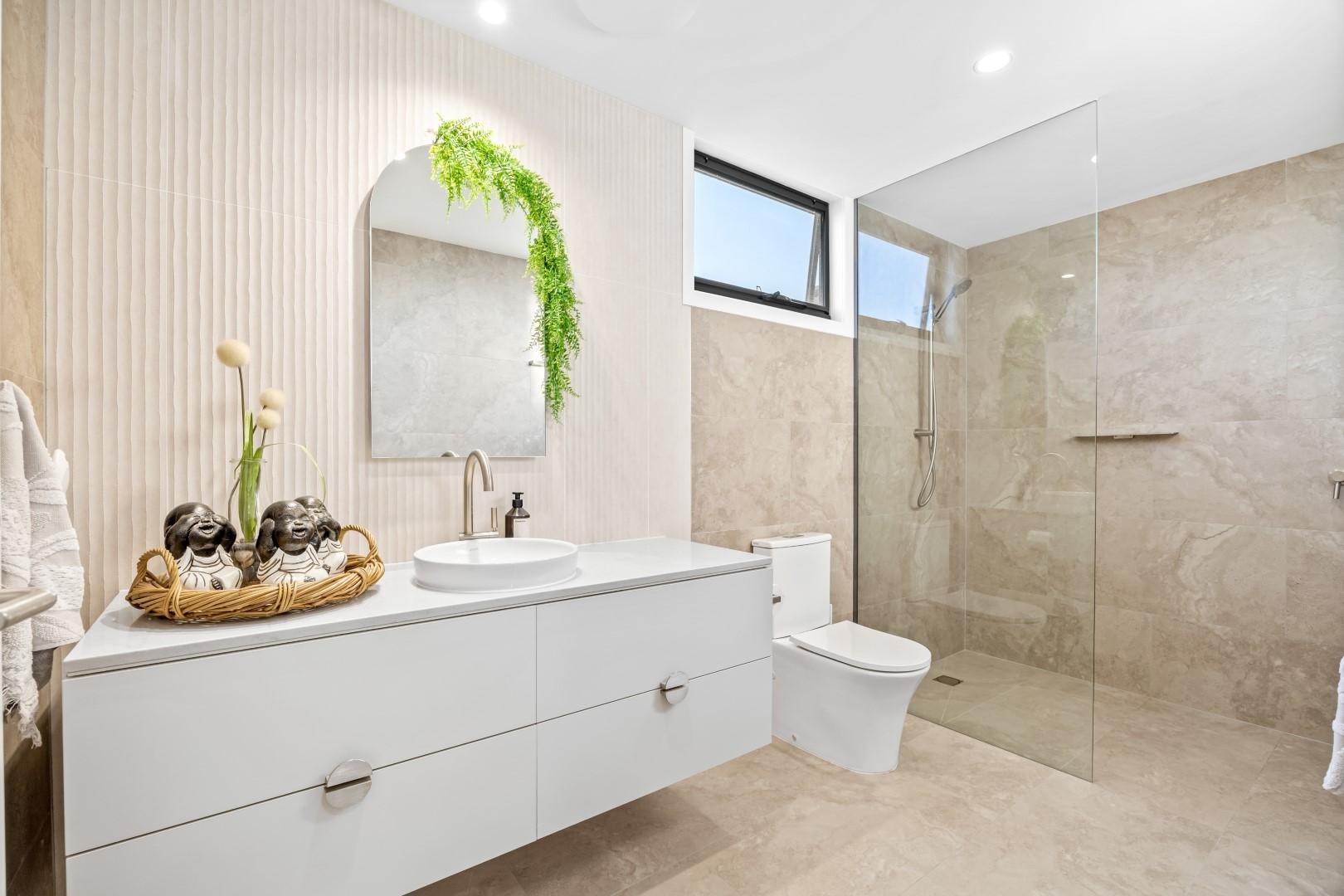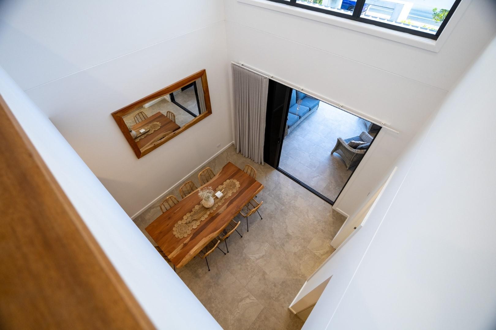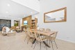 The ground floor is anchored by the private master suite, where a dramatic raked ceiling, stone finishes, and brushed nickel fittings create a sense of retreat. A gourmet kitchen with 40mm stone benchtops, 2-pac custom cabinetry and Fisher & Paykel appliances links seamlessly to the dining and living areas, which flow out to the alfresco space for effortless indoor-outdoor living.