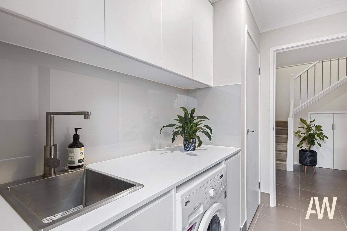 - Laundry with stone benchtops, built in cabinetry and glass splashback