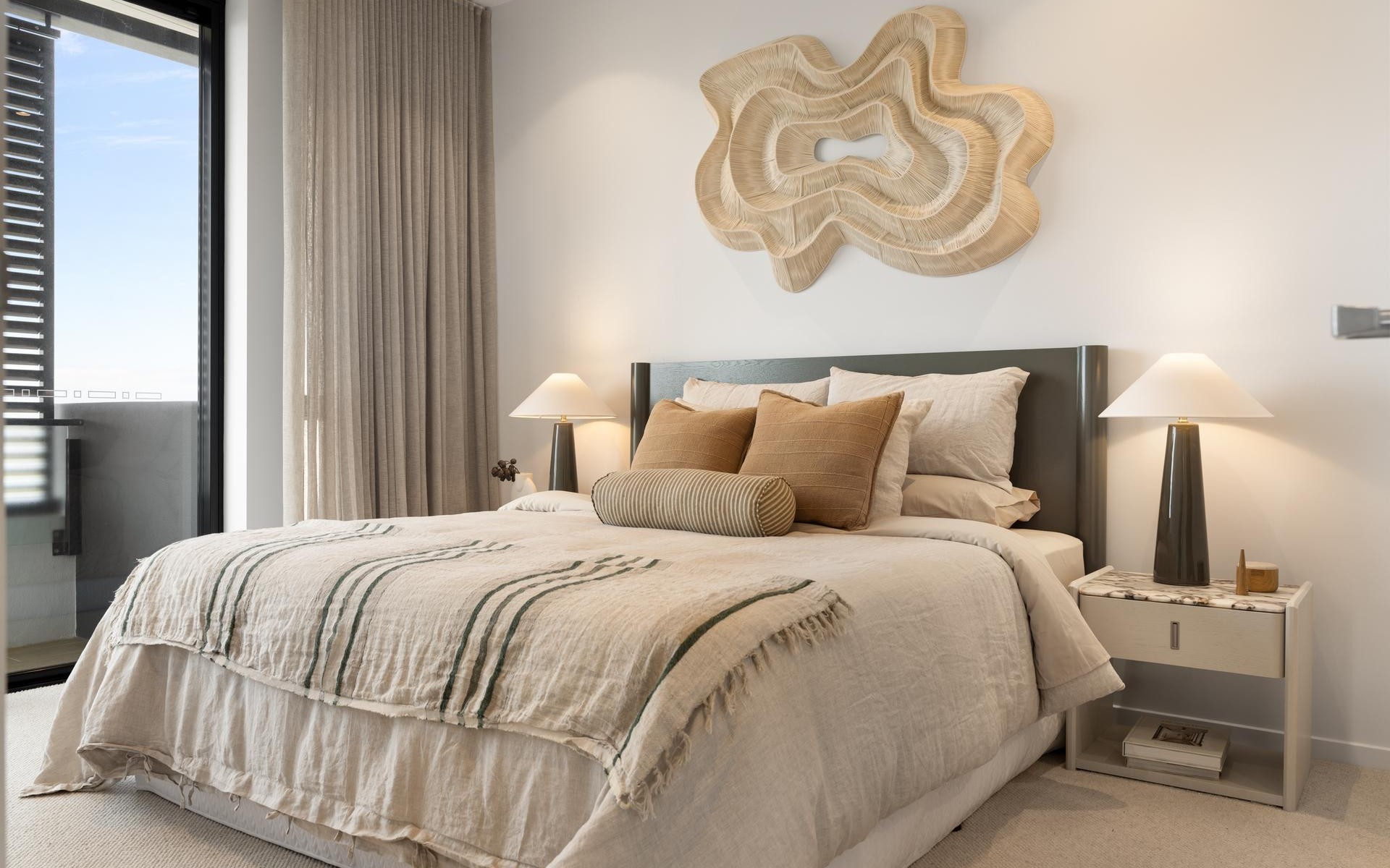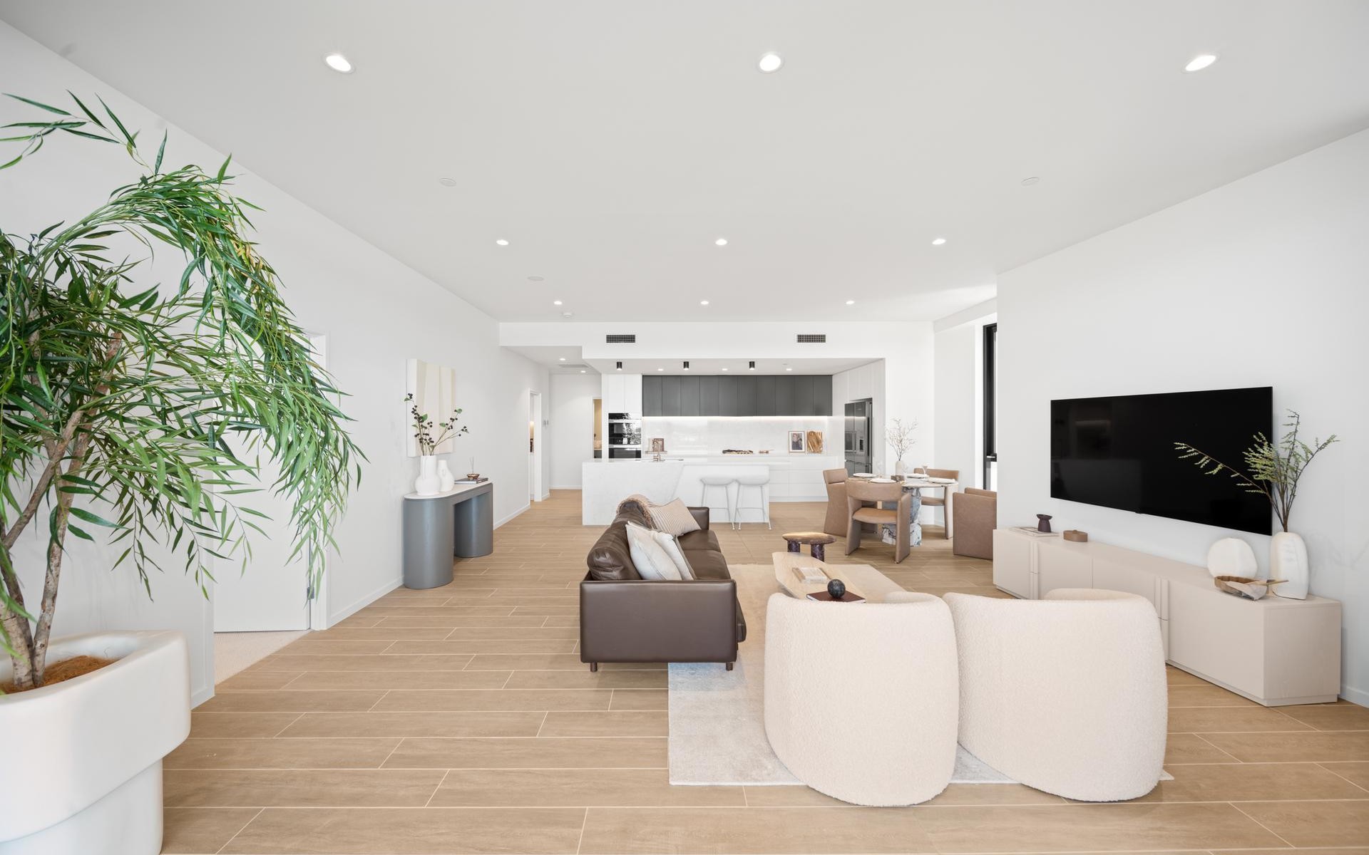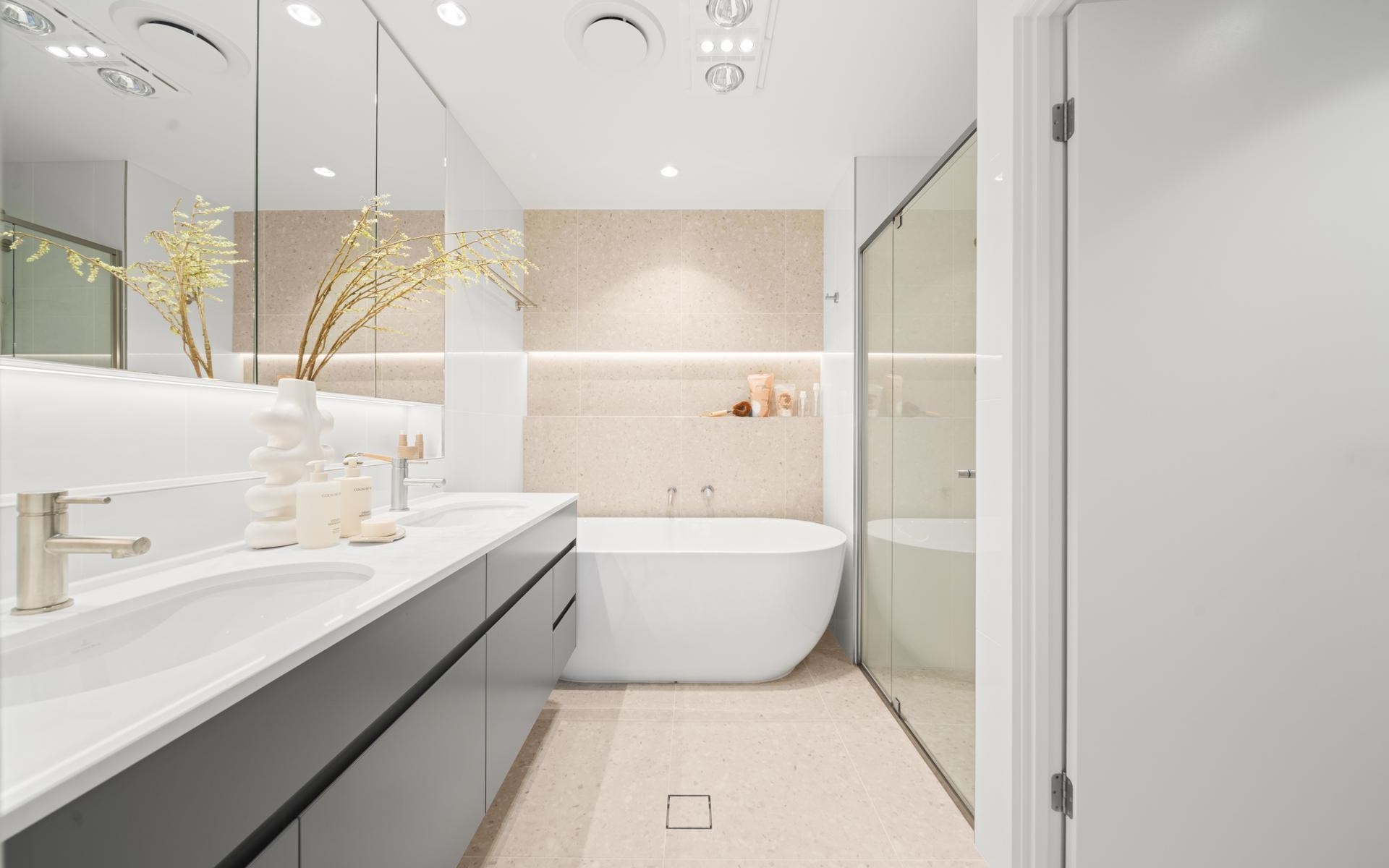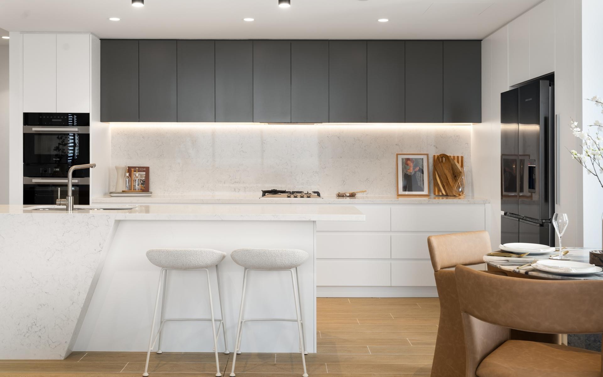 Ultra-elegant décor and high-end fixtures and fittings are featured throughout including floor to ceiling sheer curtains for dappled sunlight, ducted air-conditioning, security intercom, ceiling fans, opulent master ensuite with standalone luxe bathtub and dual vanities, stone benches, soft close cabinetry, gas cooktop with wok-burner, Miele wall oven and additional Miele Convection Oven, Miele integrated dishwasher, premium carpets in bedrooms, and generous storage.