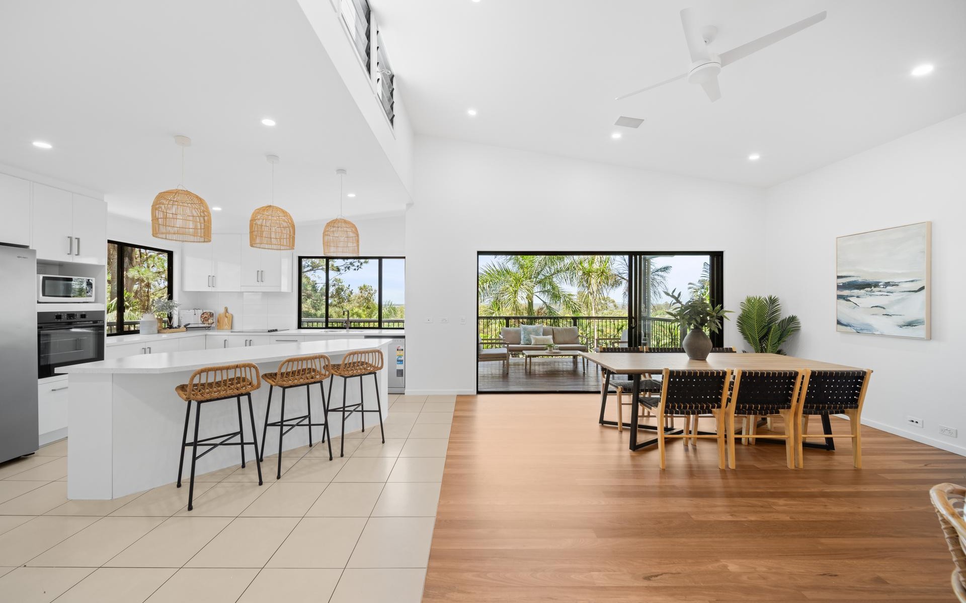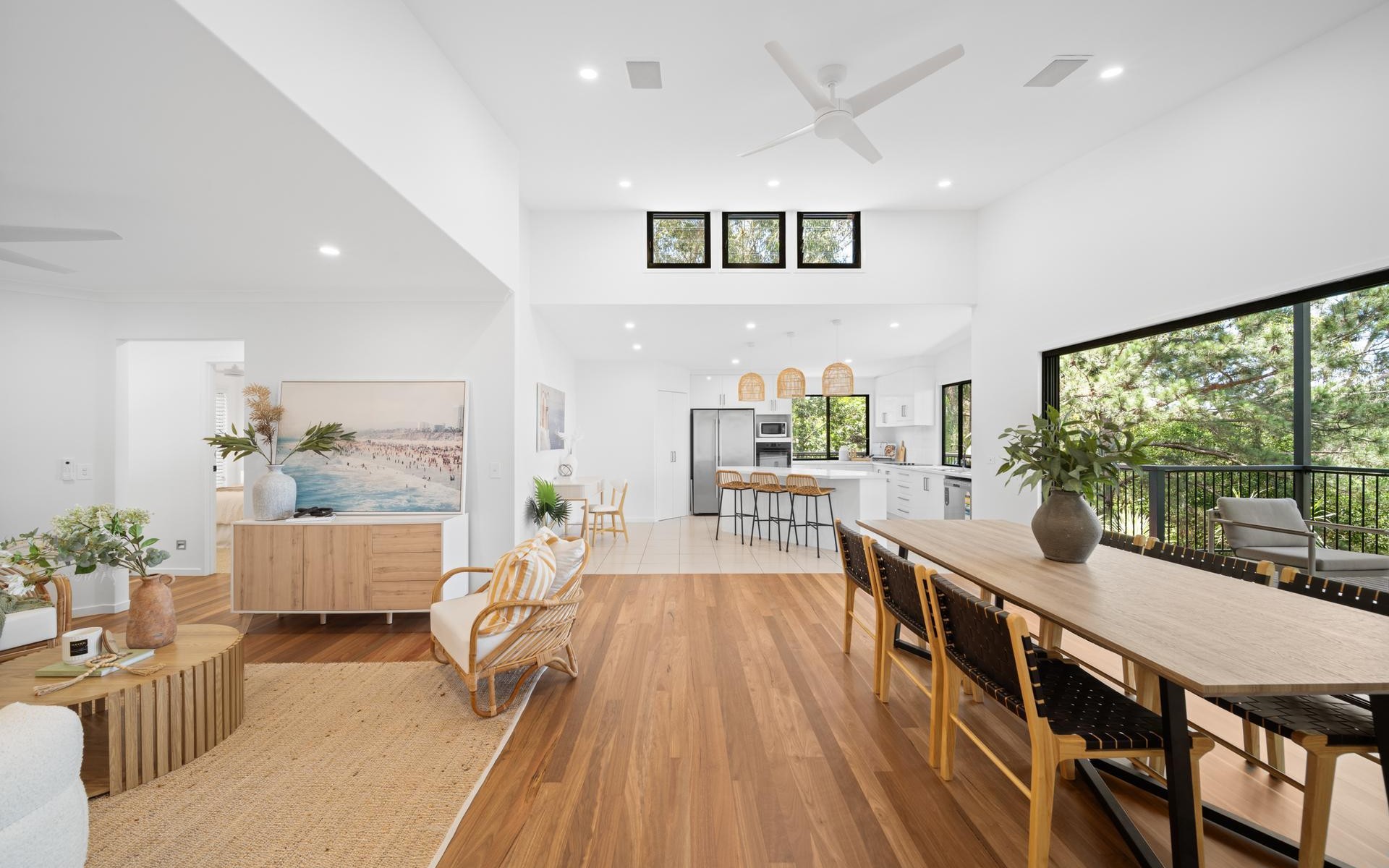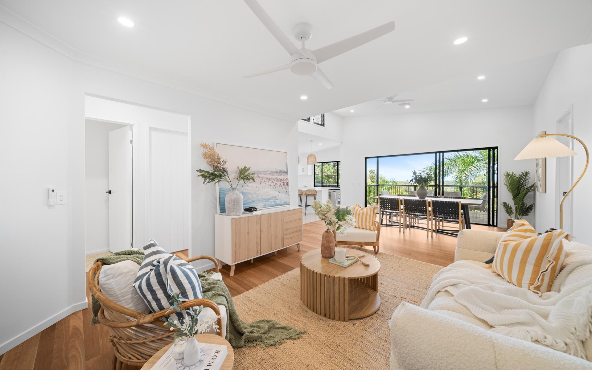 Open-plan living and dining flowing to private balcony