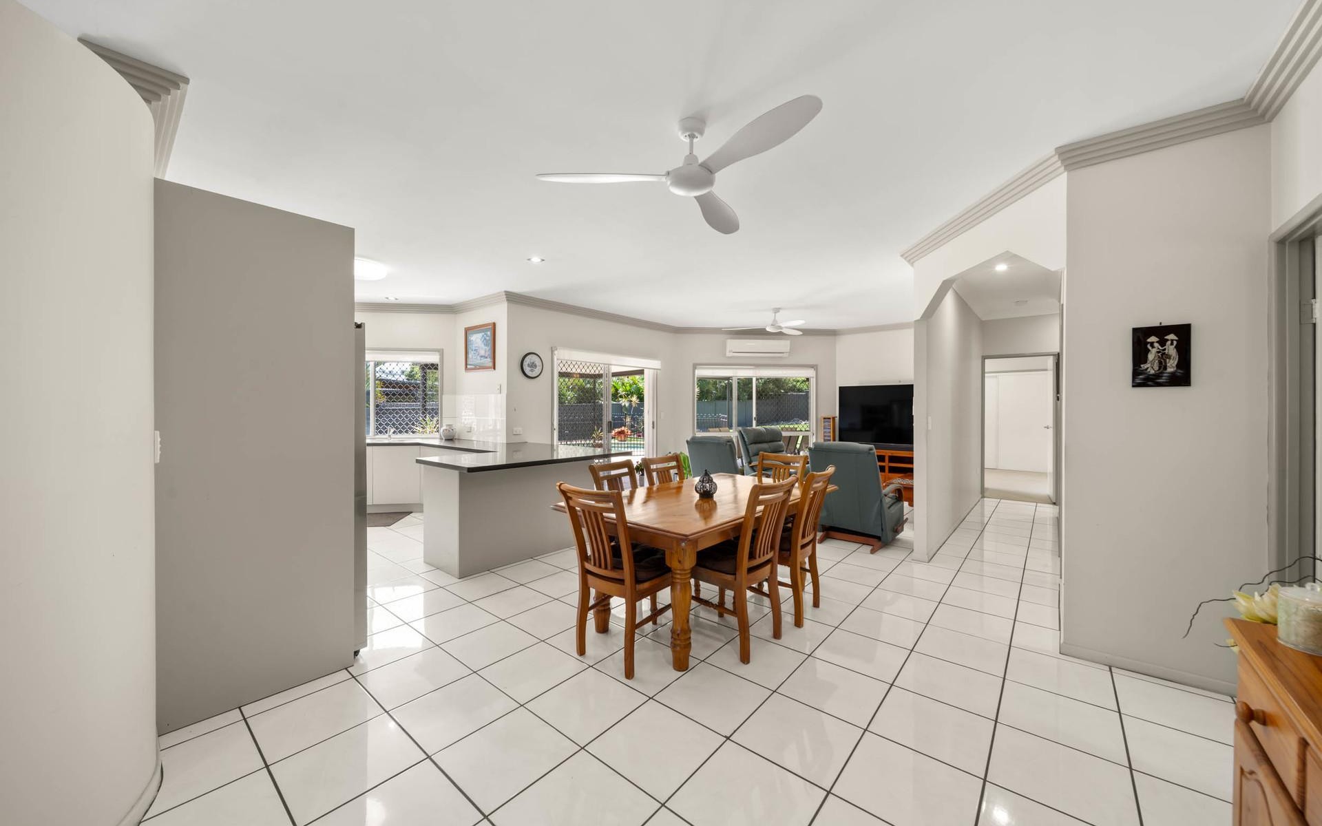 Across a single level covering approximately 411 square metres, the home comprises formal entry foyer, four bedrooms, three bathrooms, modern kitchen (stylishly updated in 2022), three separate internal living areas, huge covered alfresco poolside terrace, and two double lock-up garages.