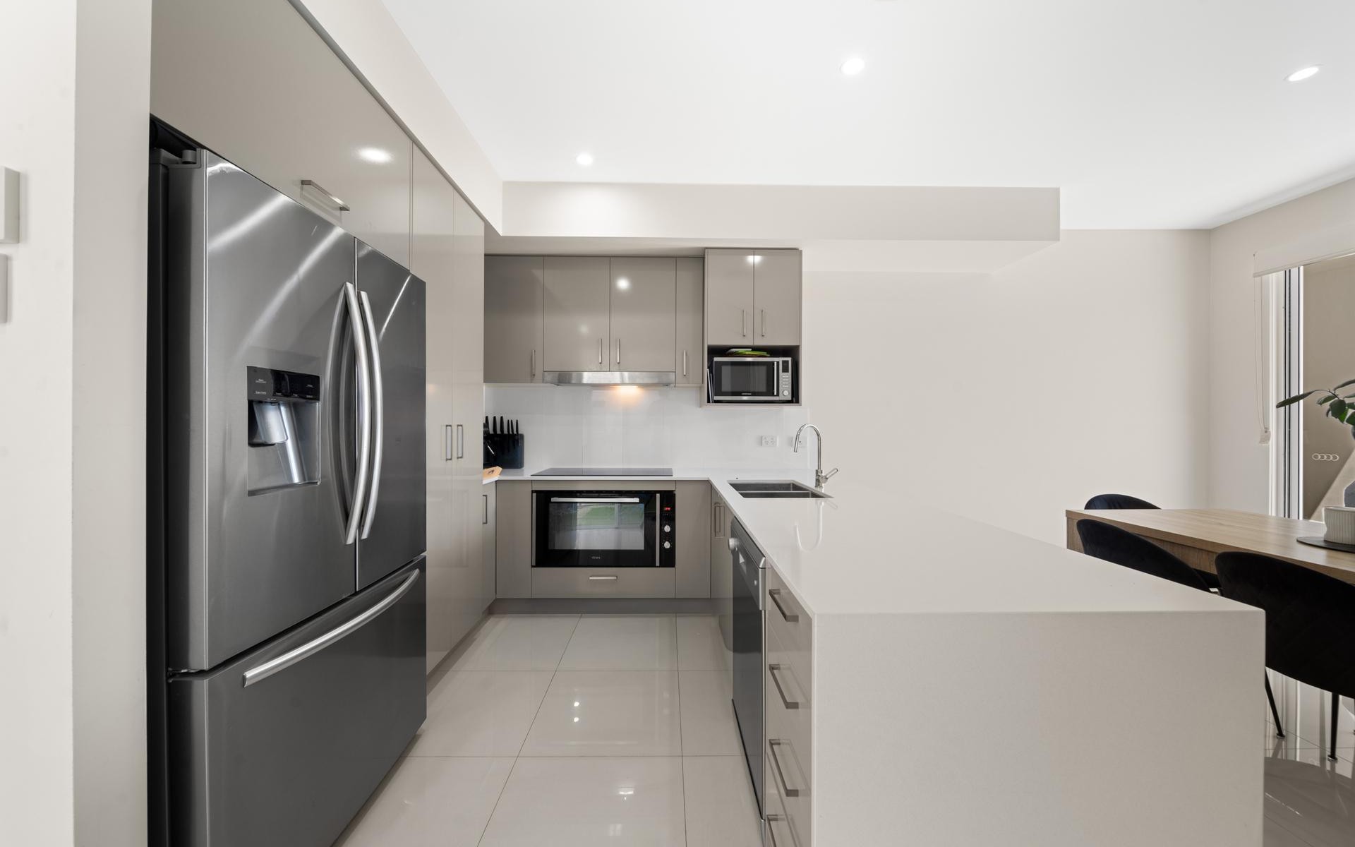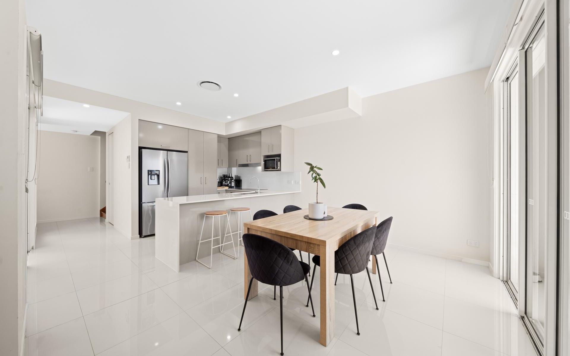 Behind the sleek facade, you'll find a thoughtfully designed two-storey home that maximises light, space, and functionality. The open-plan ground floor features a well-appointed kitchen with stone bench-tops and stainless steel appliances, flowing seamlessly to the living and dining zones. Sliding doors open to a private, enclosed alfresco courtyard, a low-maintenance space perfect for year-round entertaining or relaxed evenings outdoors.