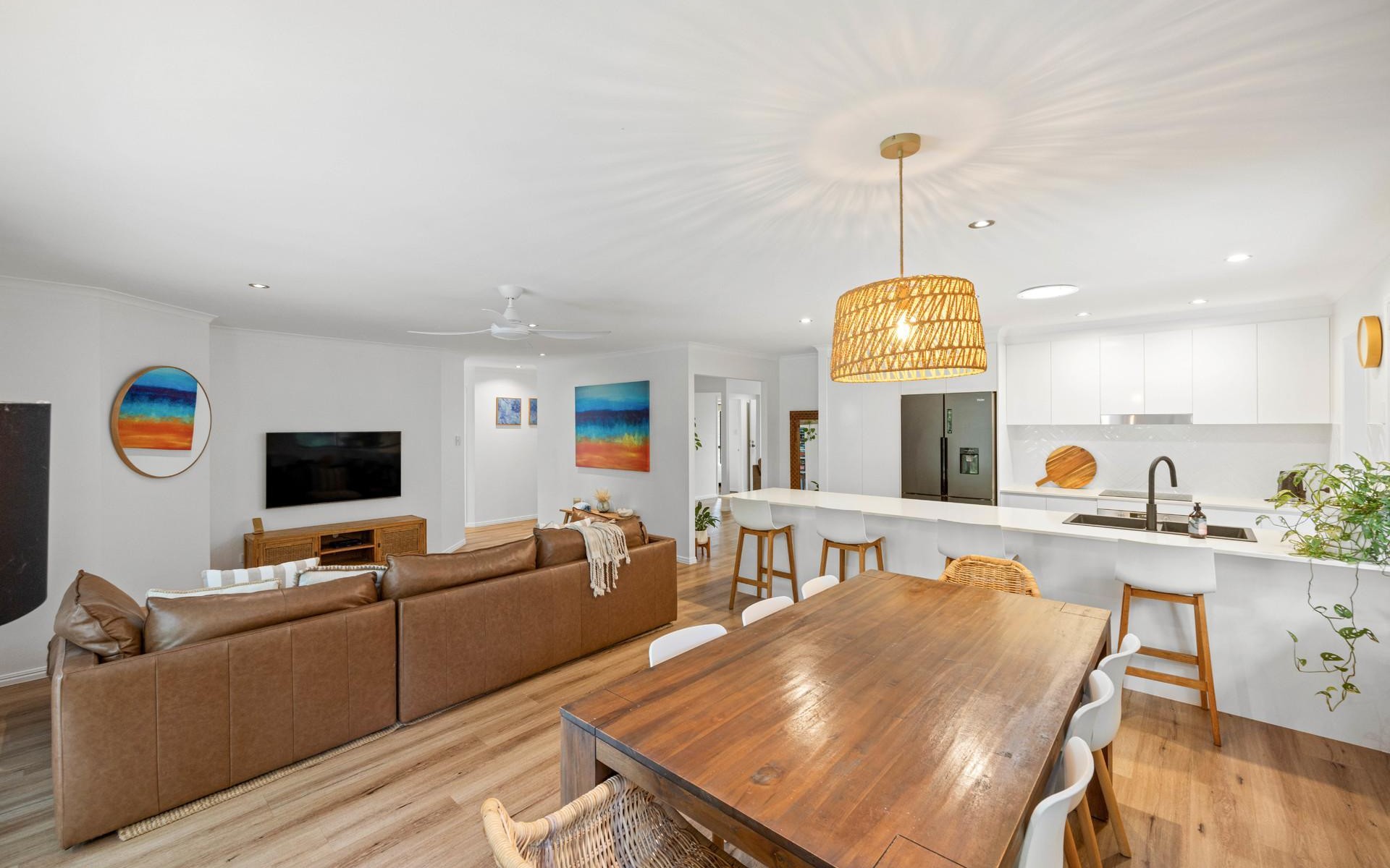 Two separate living areas provide excellent versatility for families, whether it's movie nights, kids' activities, or a quiet lounge to relax at the end of the day. The spaces flow effortlessly to the outdoors, enhancing the home's relaxed, connected feel.