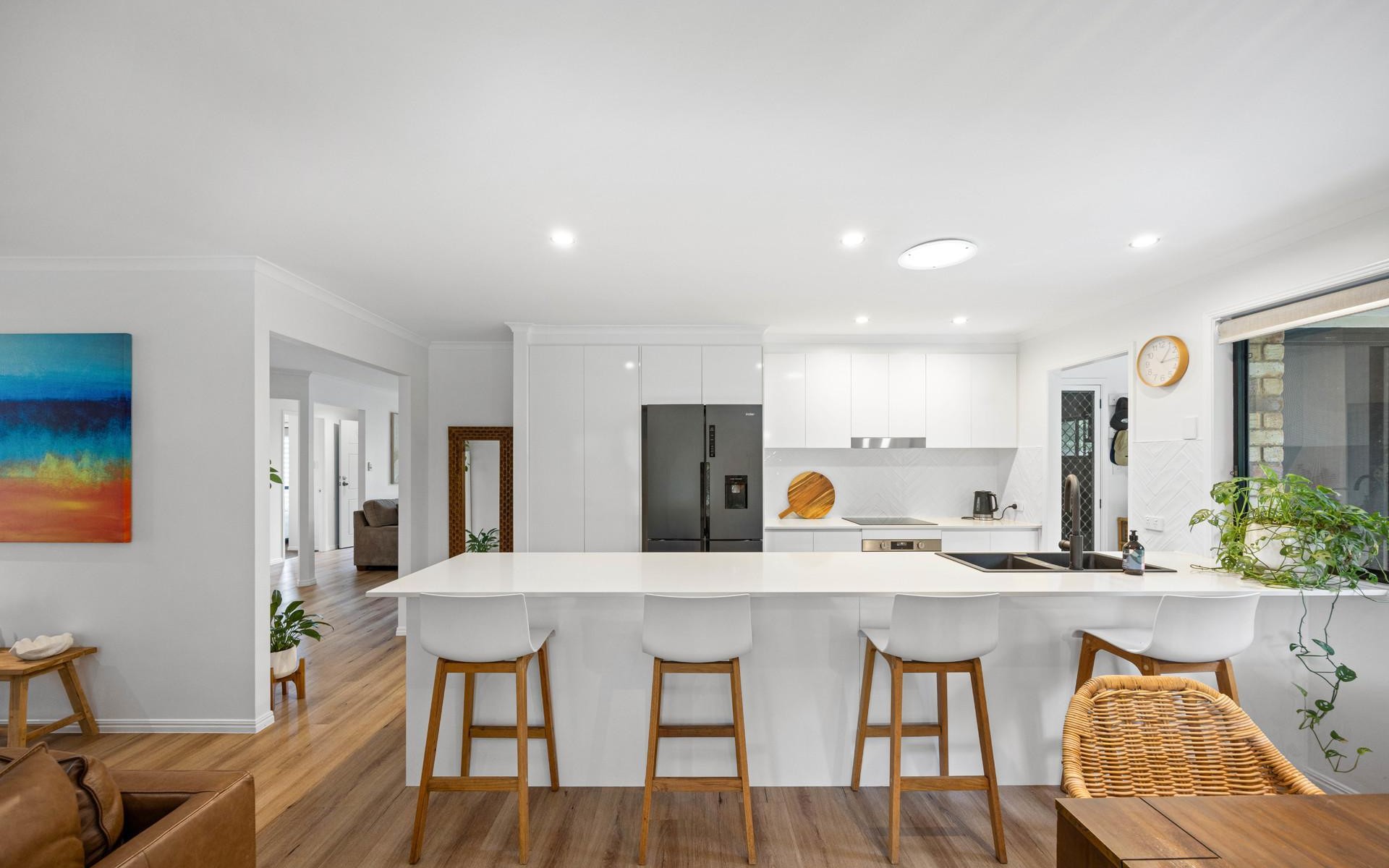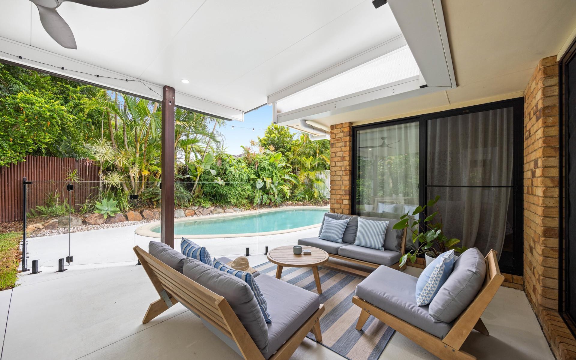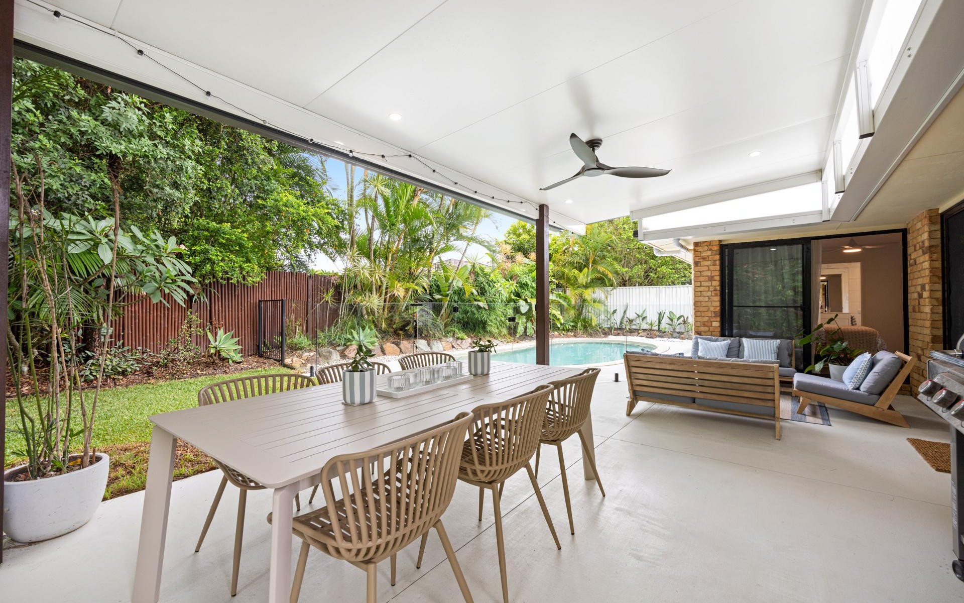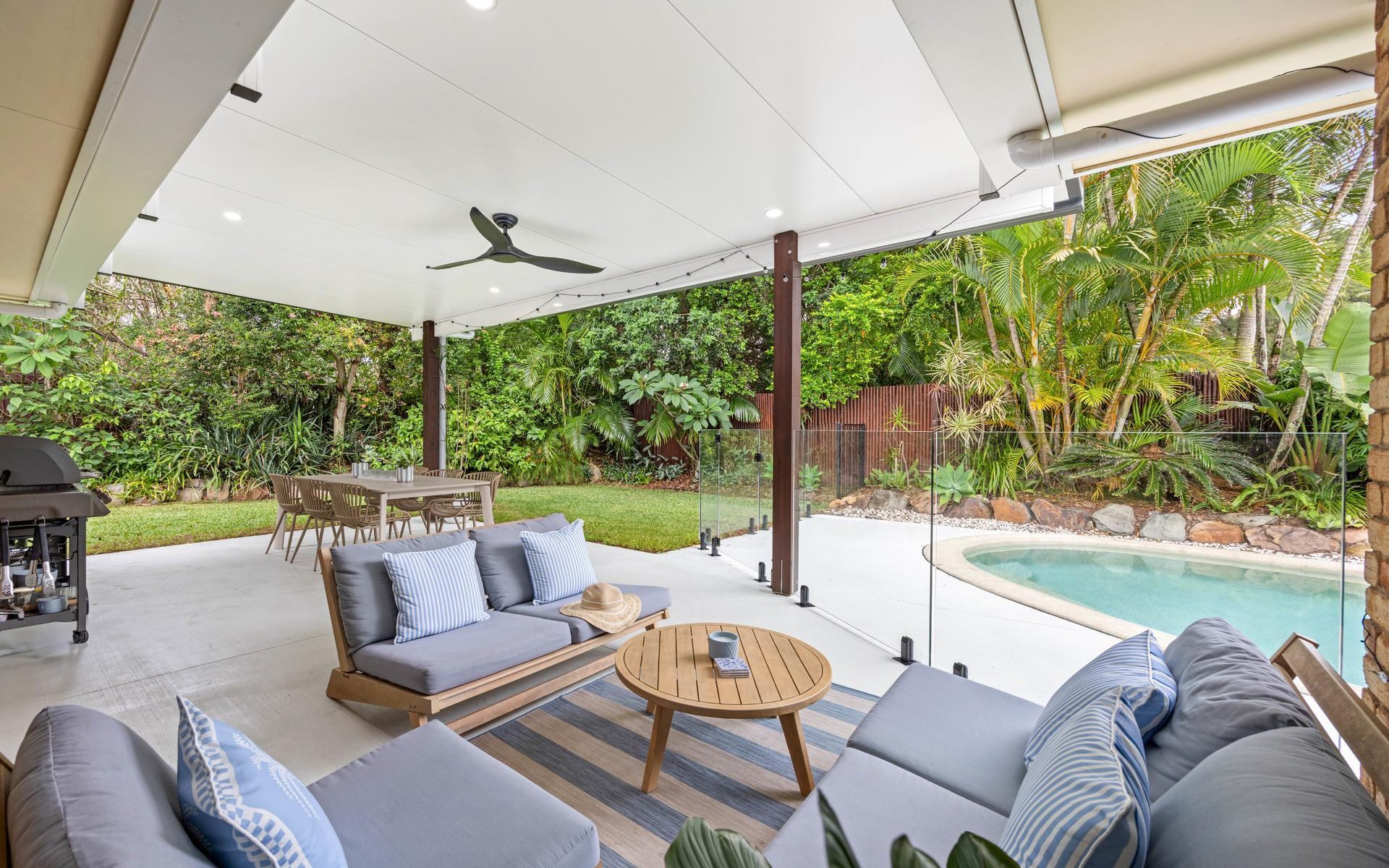 Step outside and you'll discover a private tropical backyard oasis, complete with a sparkling saltwater swimming pool surrounded by lush greenery. This inviting outdoor space complete with a spacious fly-over is perfect for entertaining, weekend barbecues, or simply enjoying the Sunshine Coast climate year-round.