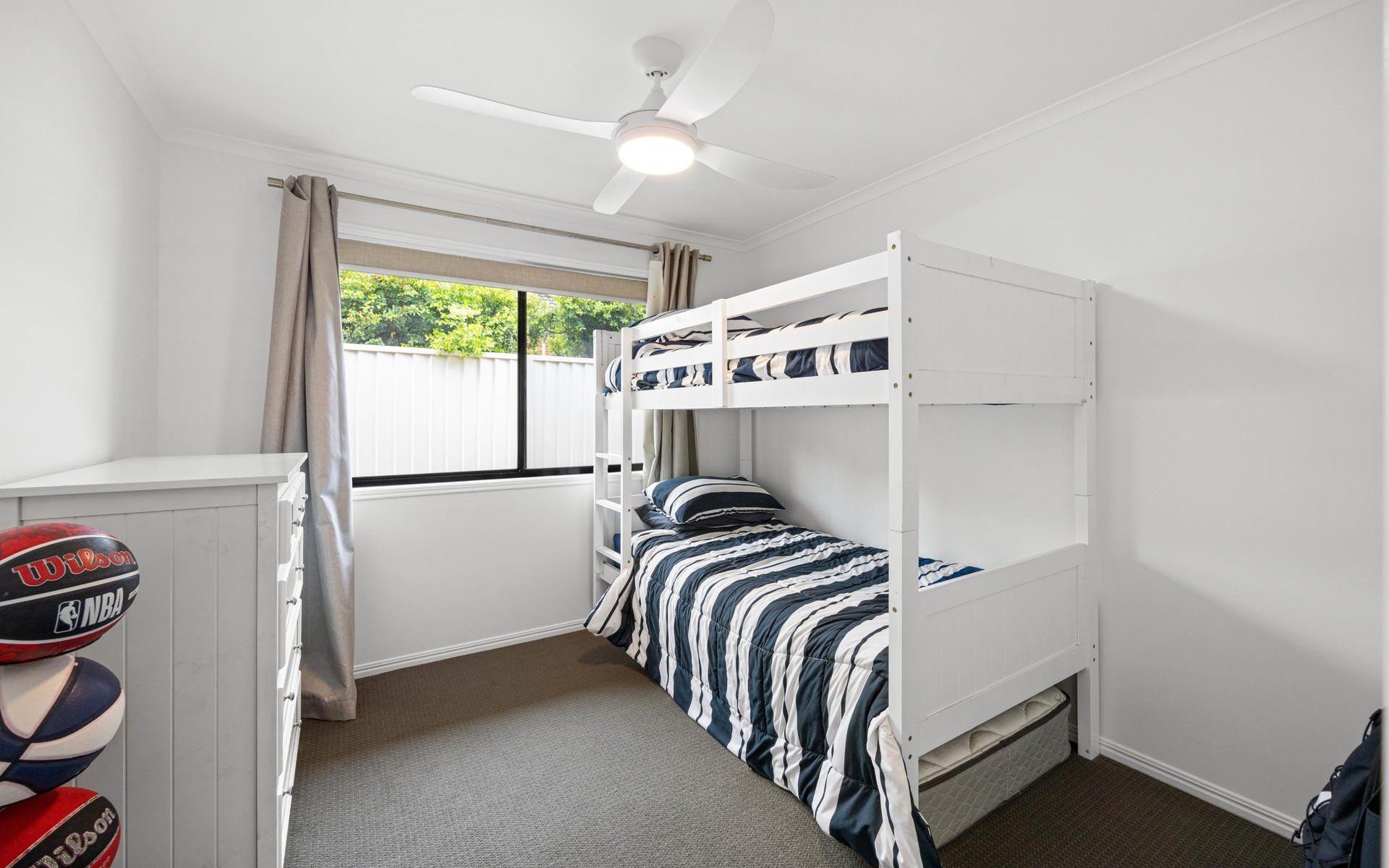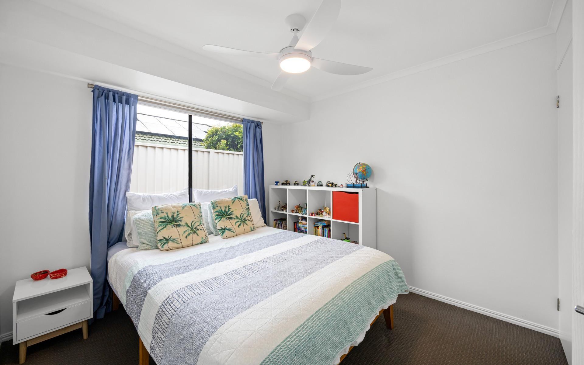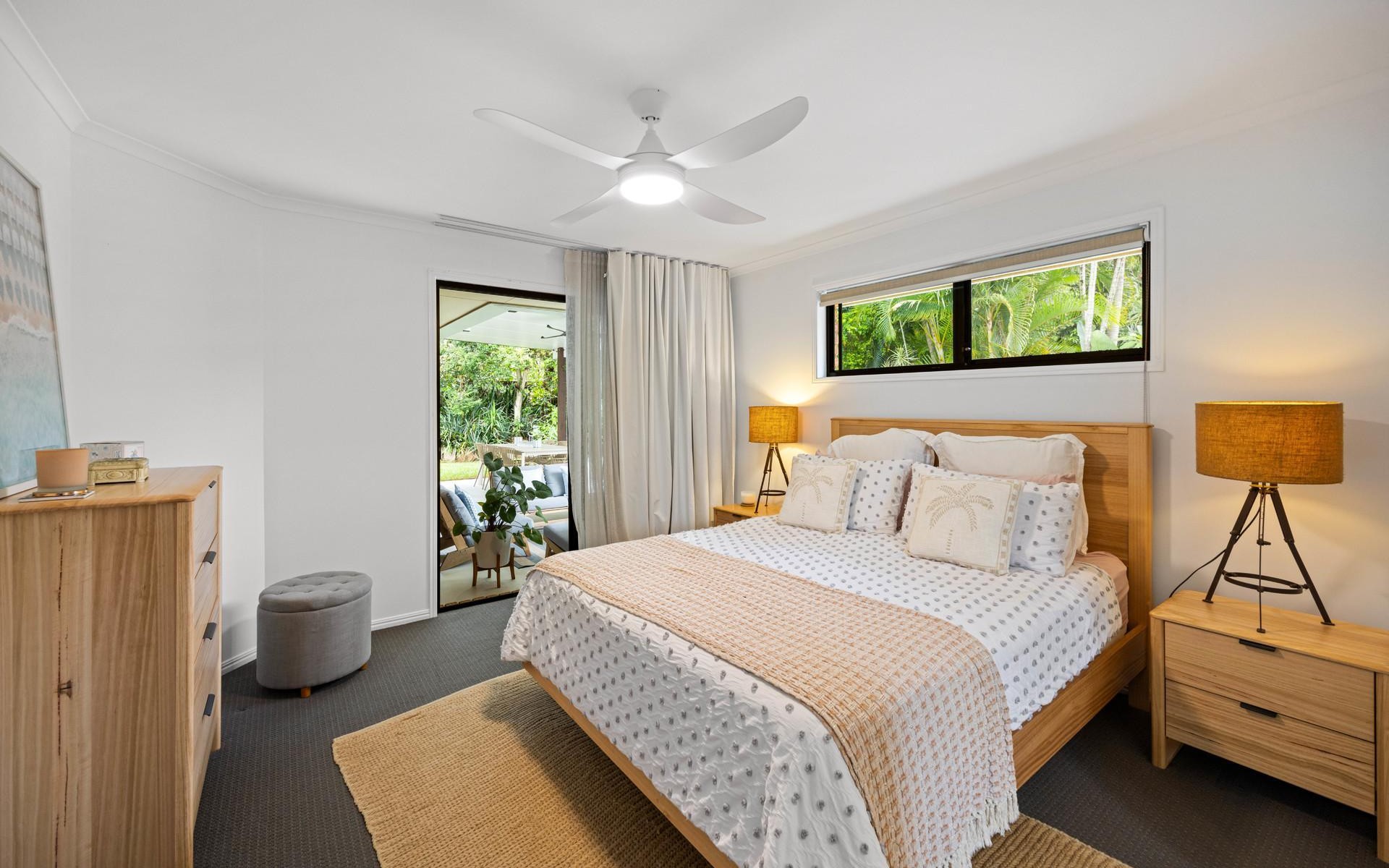 The master suite is thoughtfully positioned and includes a walk-in robe and private ensuite, creating a peaceful retreat away from the main living areas. Sliding doors allow you to step directly from the master bedroom into the outdoor entertaining and pool area, enhancing the home's seamless indooroutdoor flow and offering a truly resort-style feel. The home features an additional three generous bedrooms, all complete with built-in wardrobes and ceiling fans.