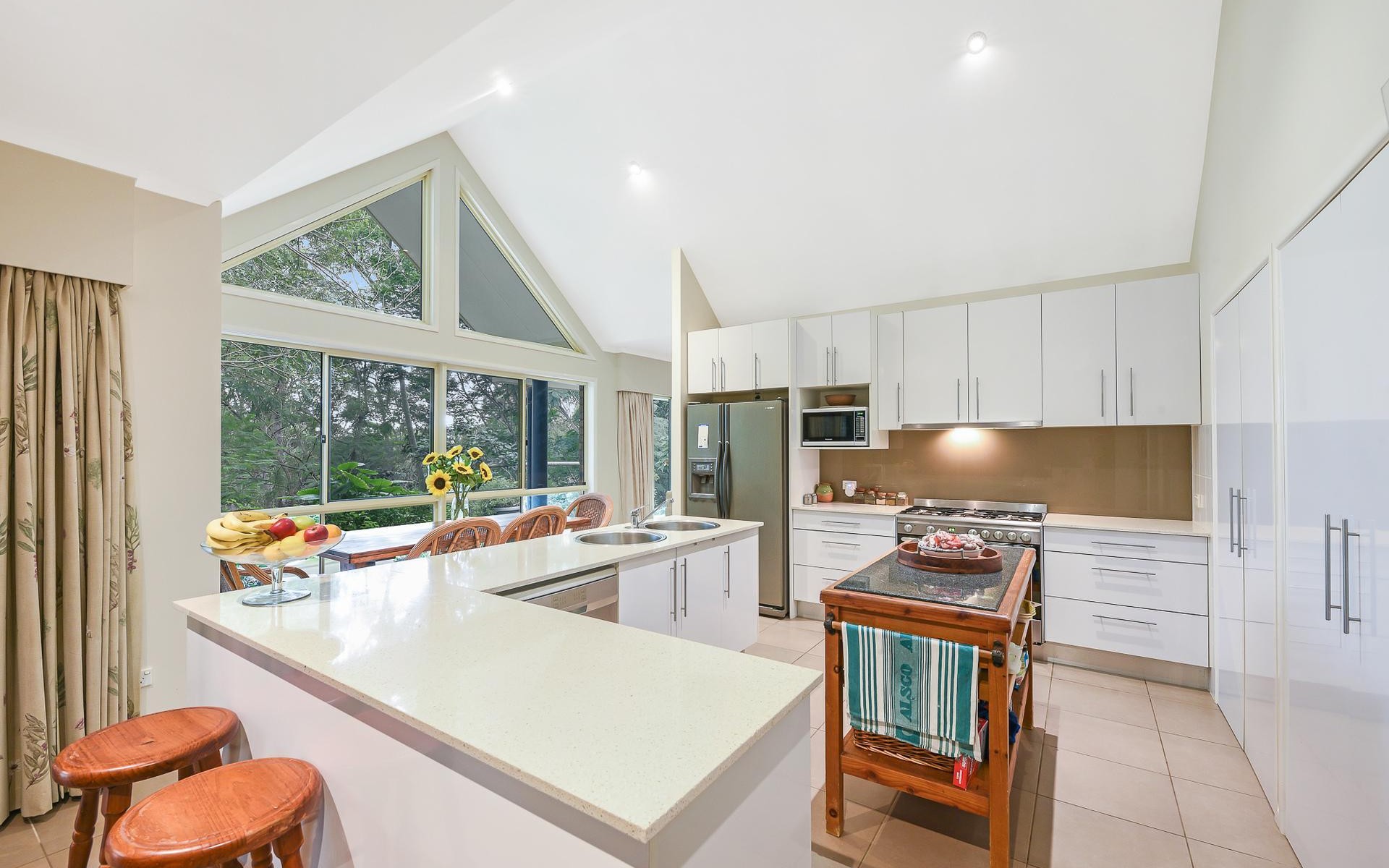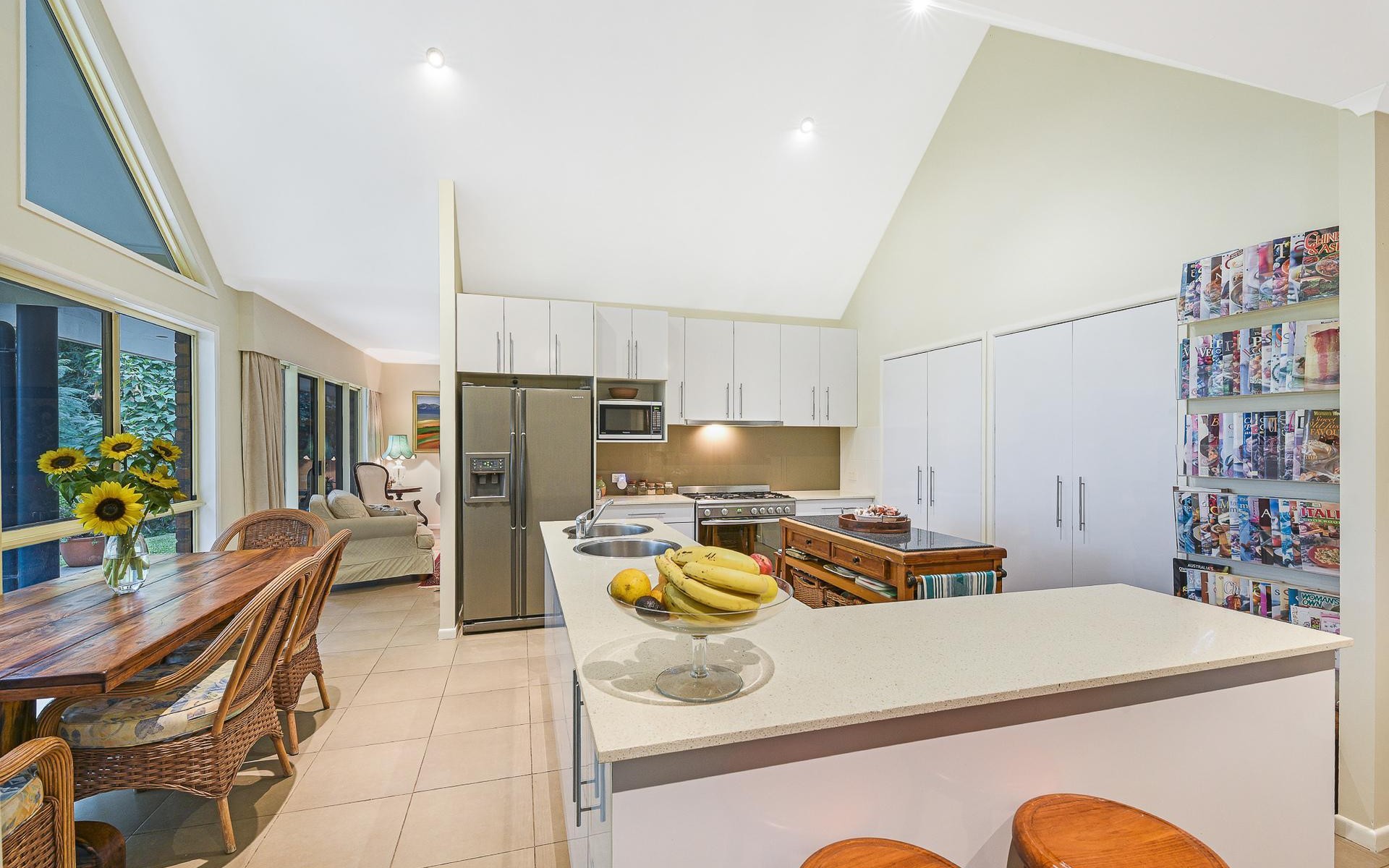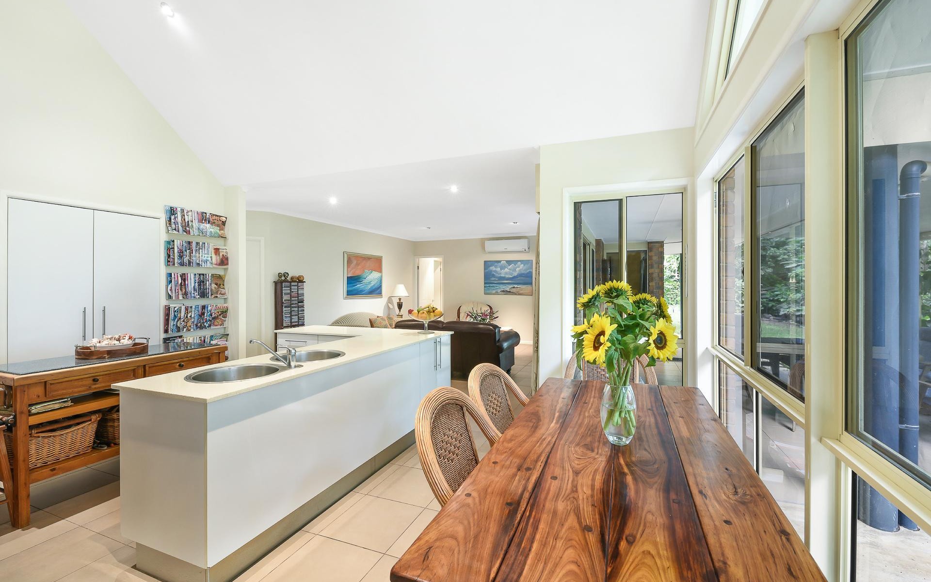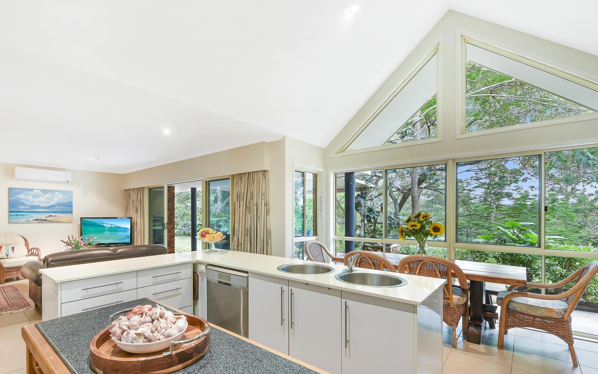 With large windows to showcase the glorious landscaped gardens that frame the home, there is a delightful outlook from every room. Other features include 9-foot ceilings, raked cathedral ceiling in the kitchen, stainless steel appliances, stone benches, gas cooktop, split-system air-conditioning in formal lounge, external access from master and second bedroom, gas hot water, rainwater tank, and bicycle septic.