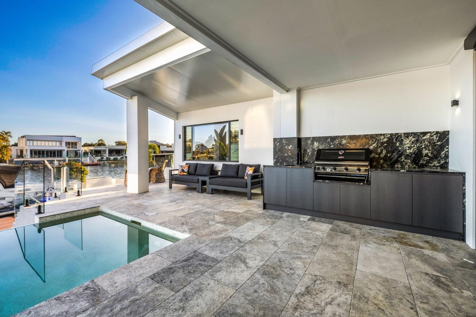 The open-plan living areas are warm and welcoming, perfect for slow mornings, lively evenings, or anything in between. You'll love the gas fireplace, the built-in sound system, and the seamless indoor-outdoor connection, with bifold doors opening wide to reveal a luxurious entertaining space. Overlooking the canal, the alfresco is complete with an outdoor kitchen, electric blinds, and a sparkling waterfall-edge pool that brings a sense of calm and understated luxury to everyday life. Whether you're hosting a long lunch, cooling off in the pool, or simply enjoying the water views, this outdoor space invites you to relax and unwind in complete comfort.