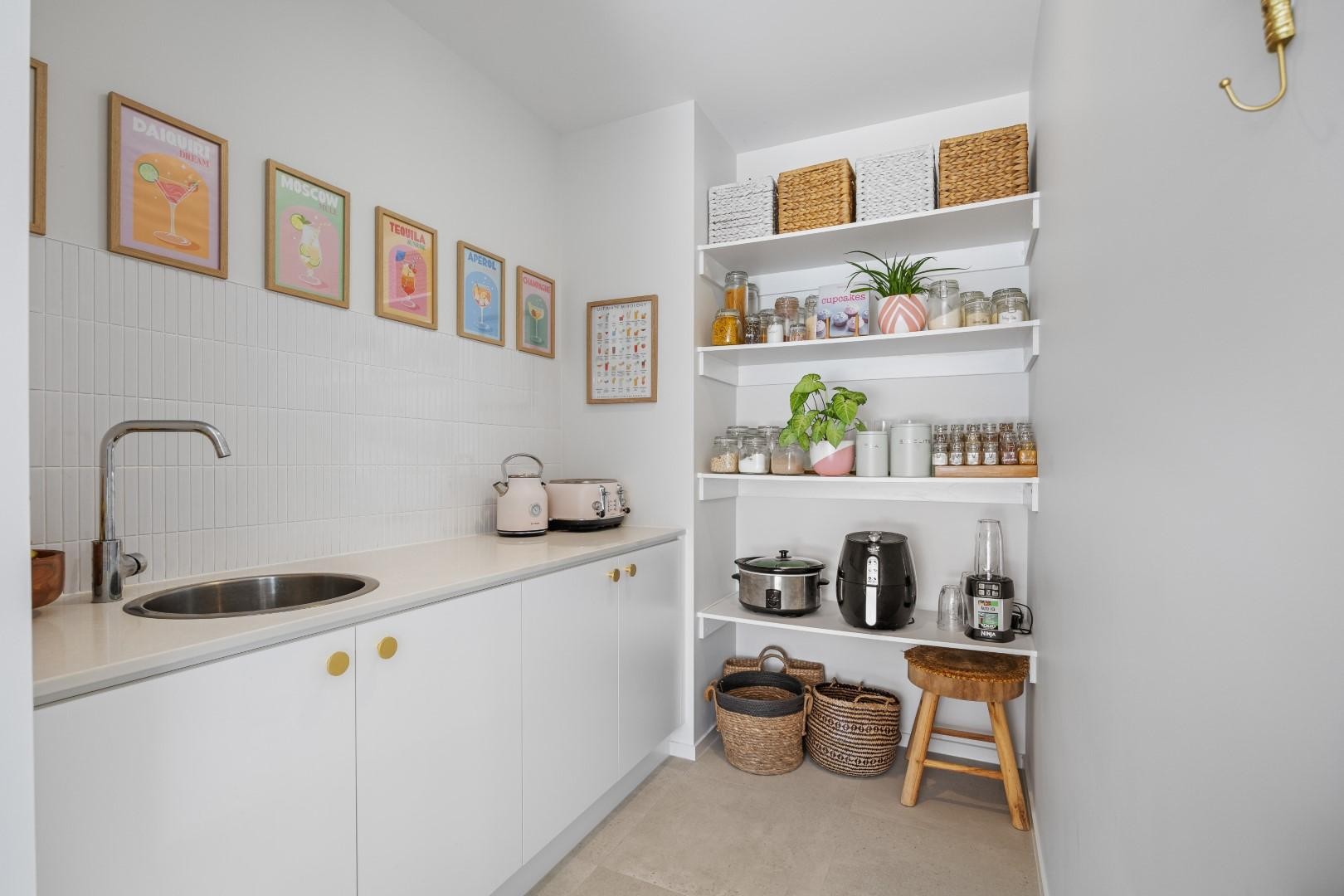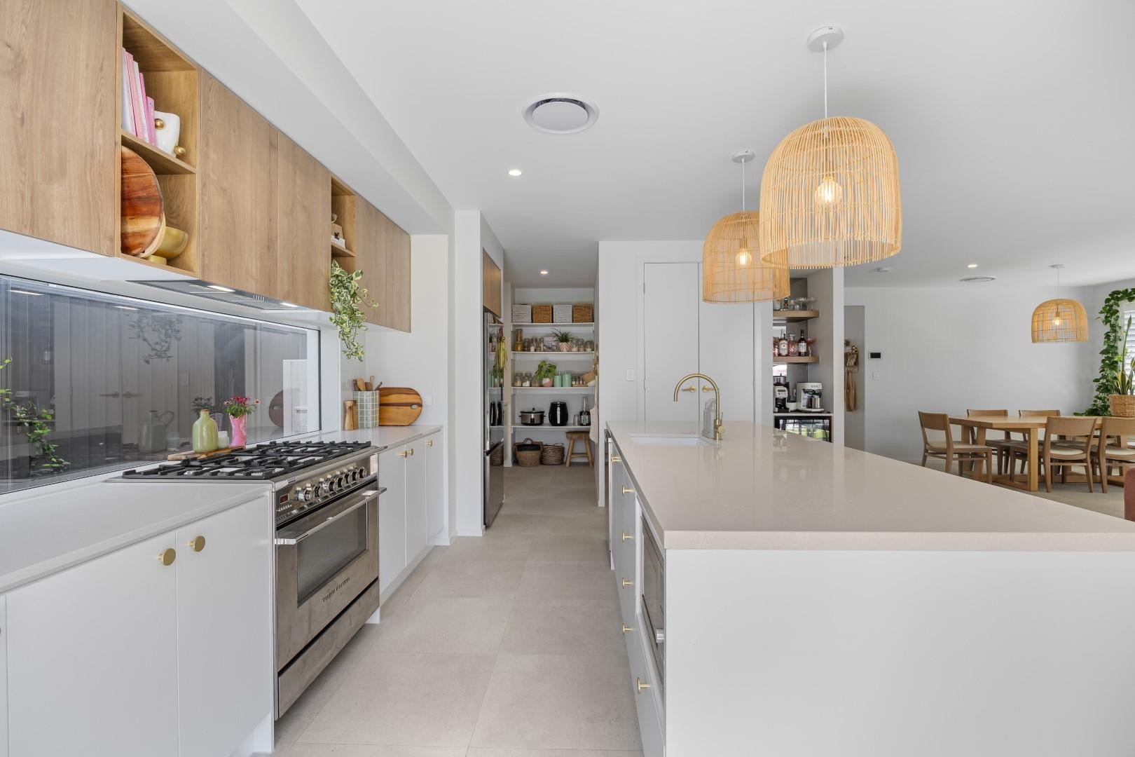 The heart of this home lies in its impressive open plan living area, which offers a seamless flow between the indoors and outdoors. The stylish kitchen is a chef's dream, featuring premium Fisher & Paykel appliances, including a free standing gas cooker, dishwasher, and built-in microwave. The convenient butler's pantry with a sink adds additional storage and functionality, perfect for keeping your kitchen organised. A striking 40mm stone island bench serves as the centrepiece of the kitchen, offering both a practical workspace and a stylish focal point.