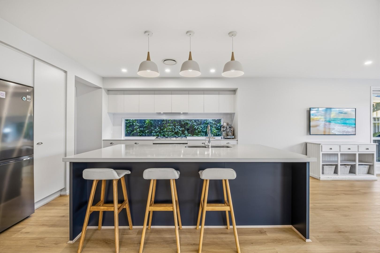 Designed for both everyday living and effortless entertaining, the home offers a well-considered layout with multiple living zones and seamless indoor outdoor integration. High 2550mm ceilings and a light, neutral coastal palette enhance the sense of space, while durable vinyl flooring and quality finishes ensure a refined yet low-maintenance environment.