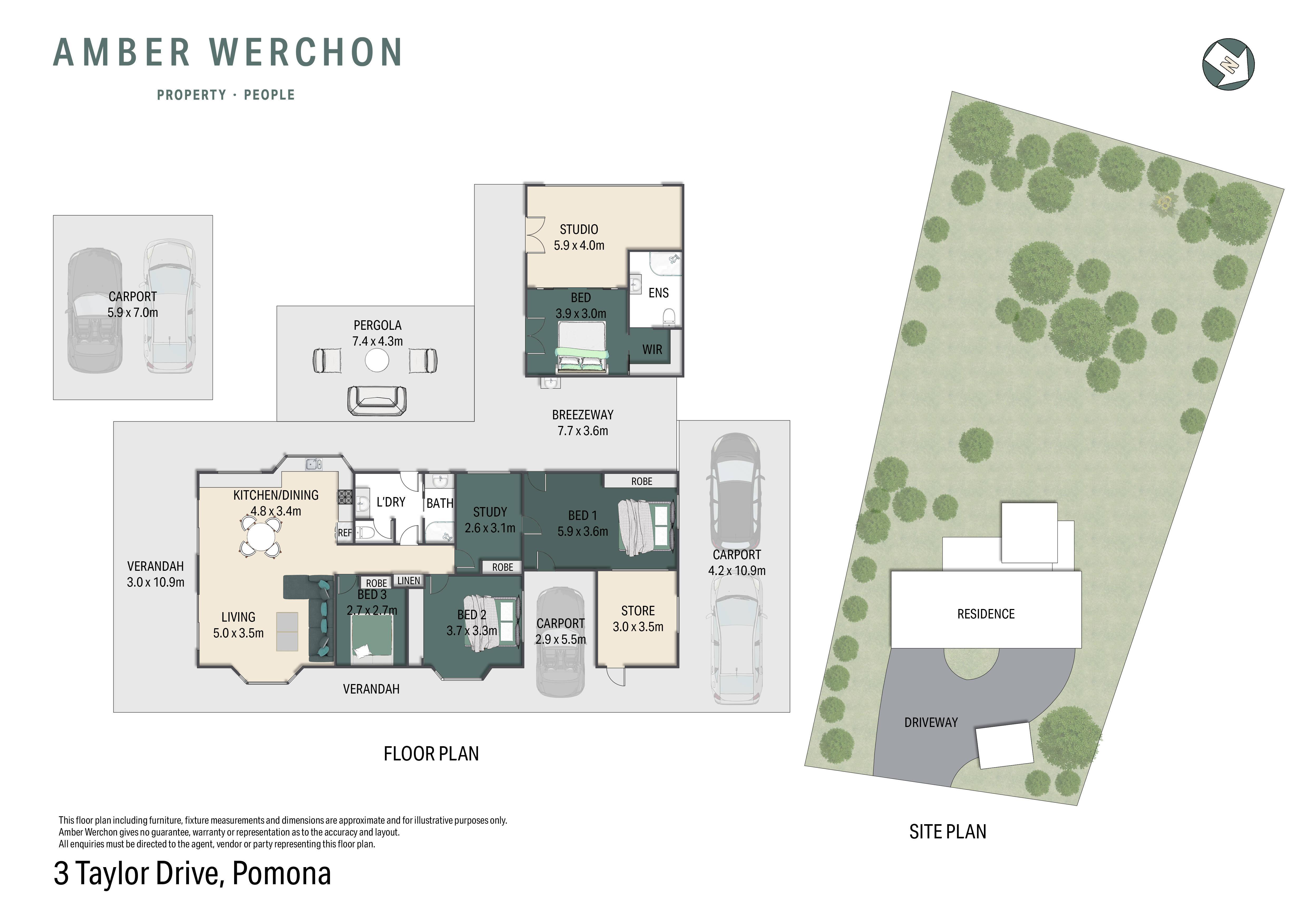 Across a single level, the main residence comprises three bedrooms, one bathroom, study, open plan living, light-filled modern kitchen, storeroom with both internal and external access, wraparound verandah, paved terrace under pergola, separate laundry, and extra-length lock-up carport to park two vehicles (tandem), plus a third carport space.
