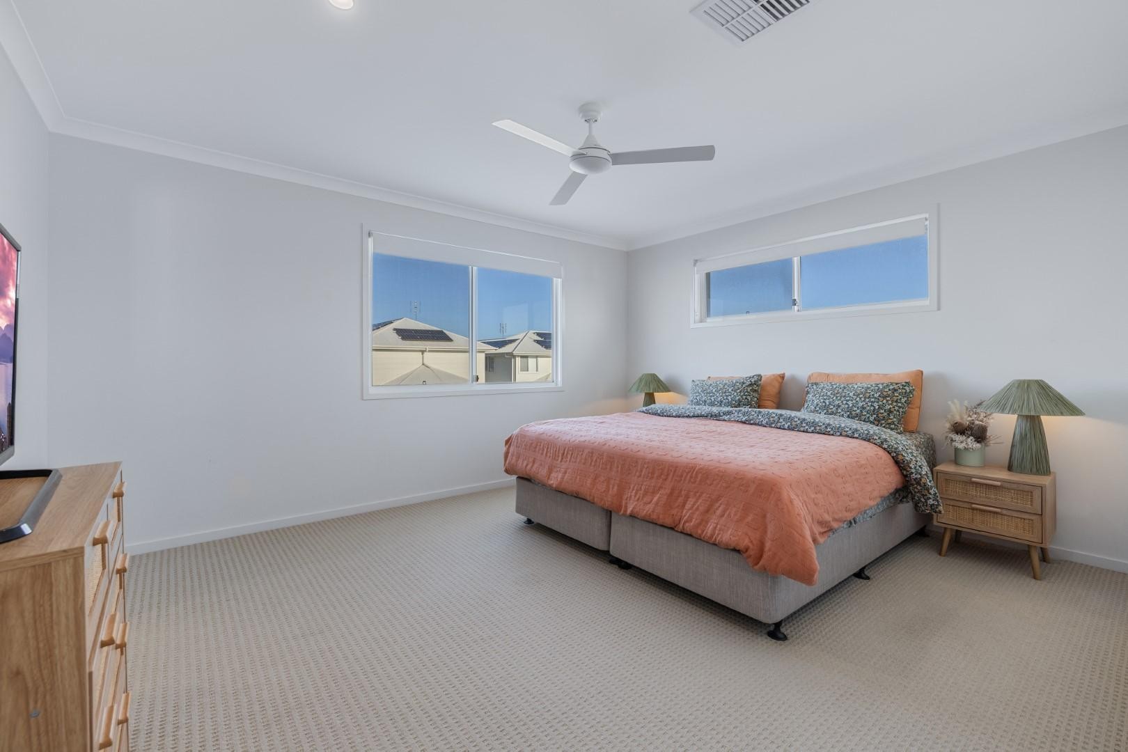 Throughout the home, there's no shortage of storage space, with a large walk-in linen cupboard that keeps everything organized. The epoxy flooring in the garage adds a modern touch, while practical features like ducted air-conditioning and 4.4kW solar panels ensure comfort and energy efficiency year-round.