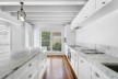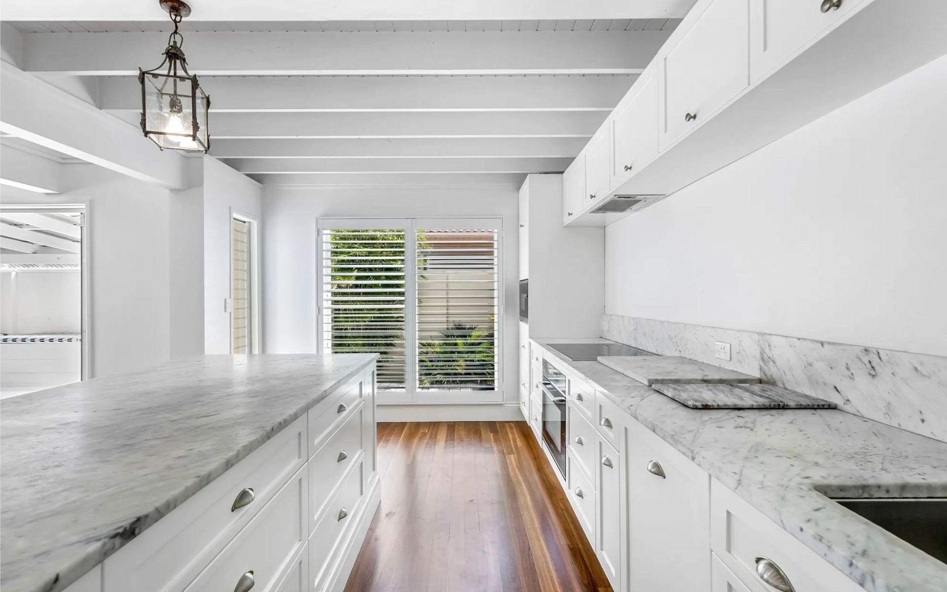 Gourmet kitchen with marble island and breakfast servery flowing into open-plan living