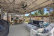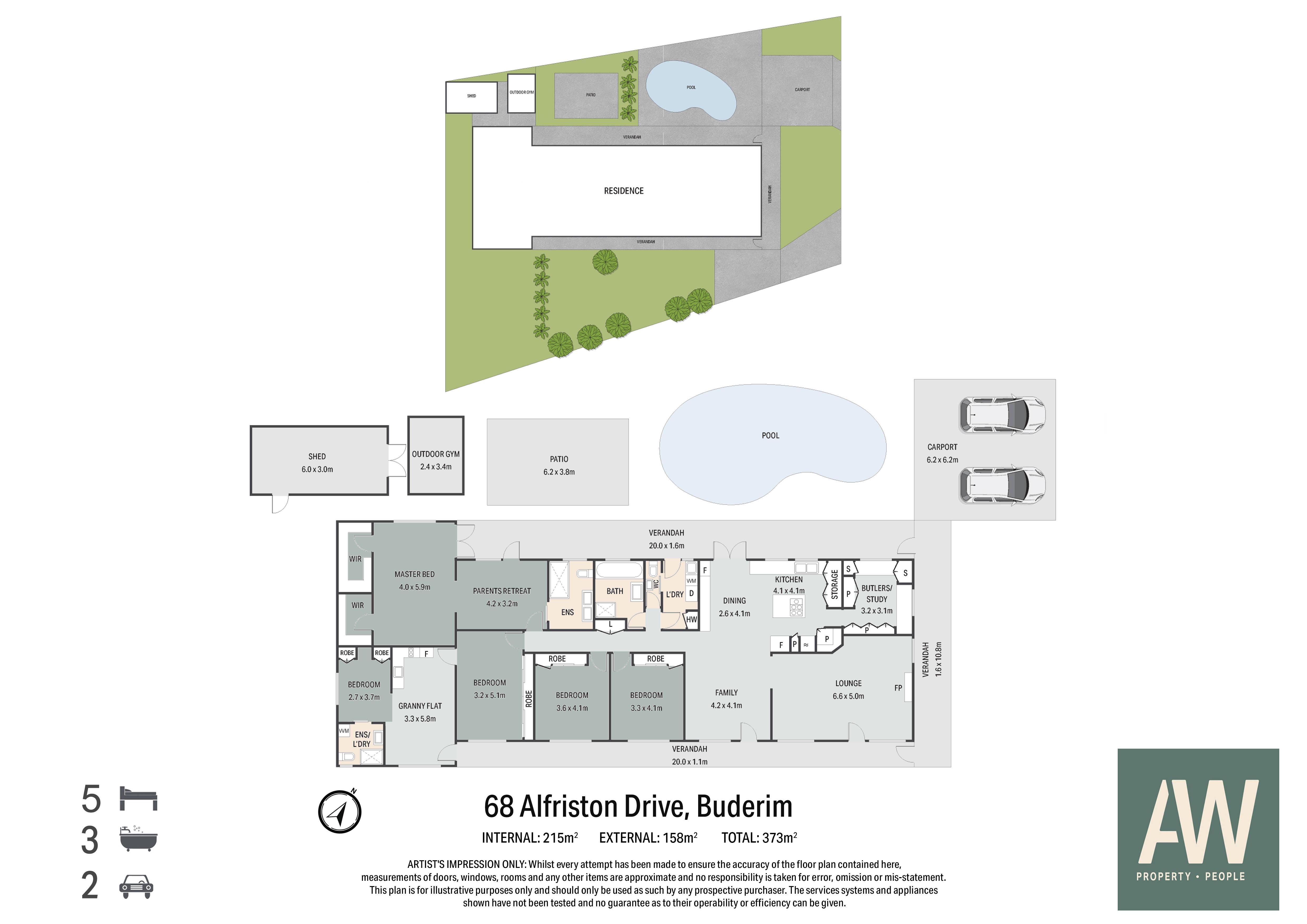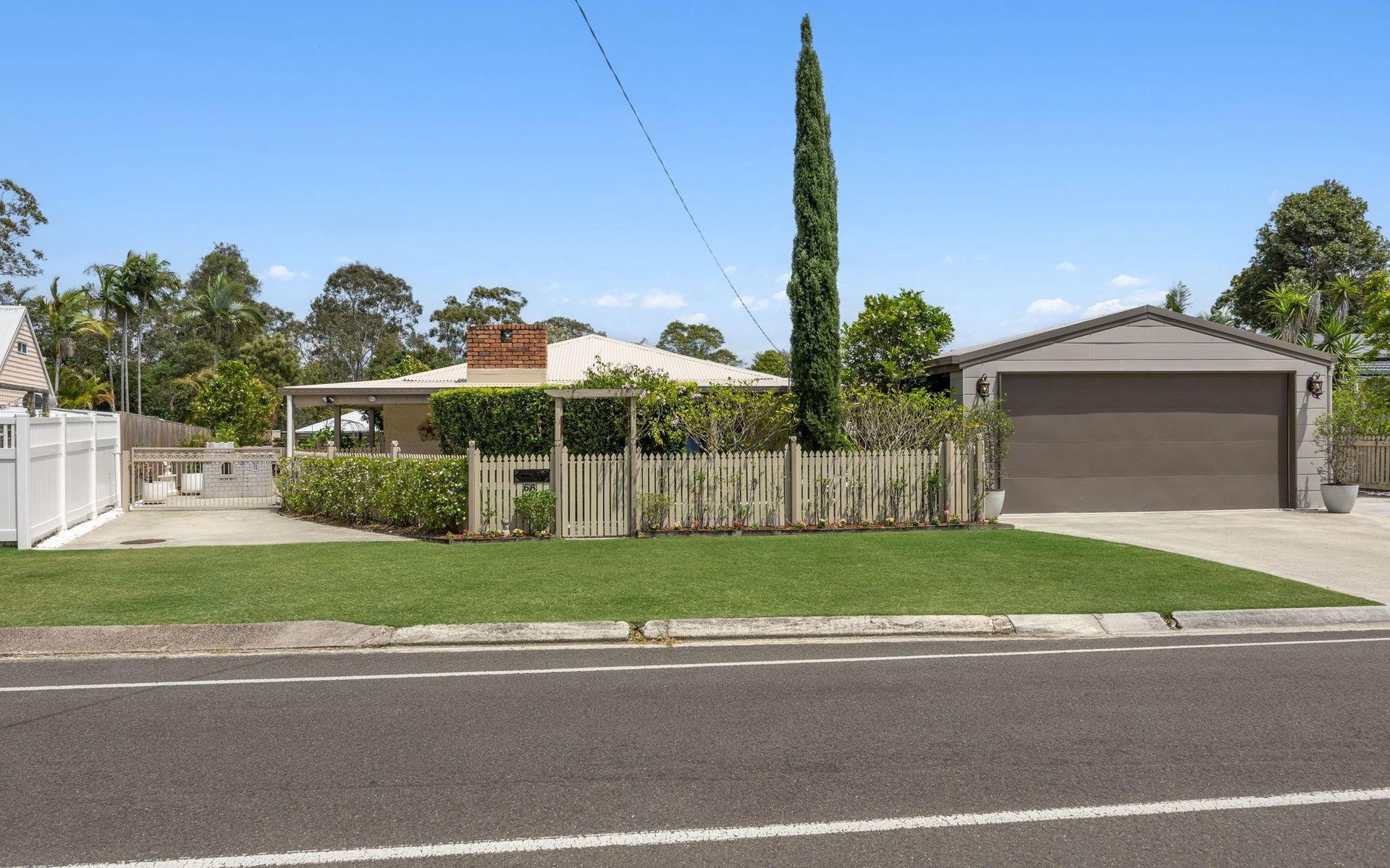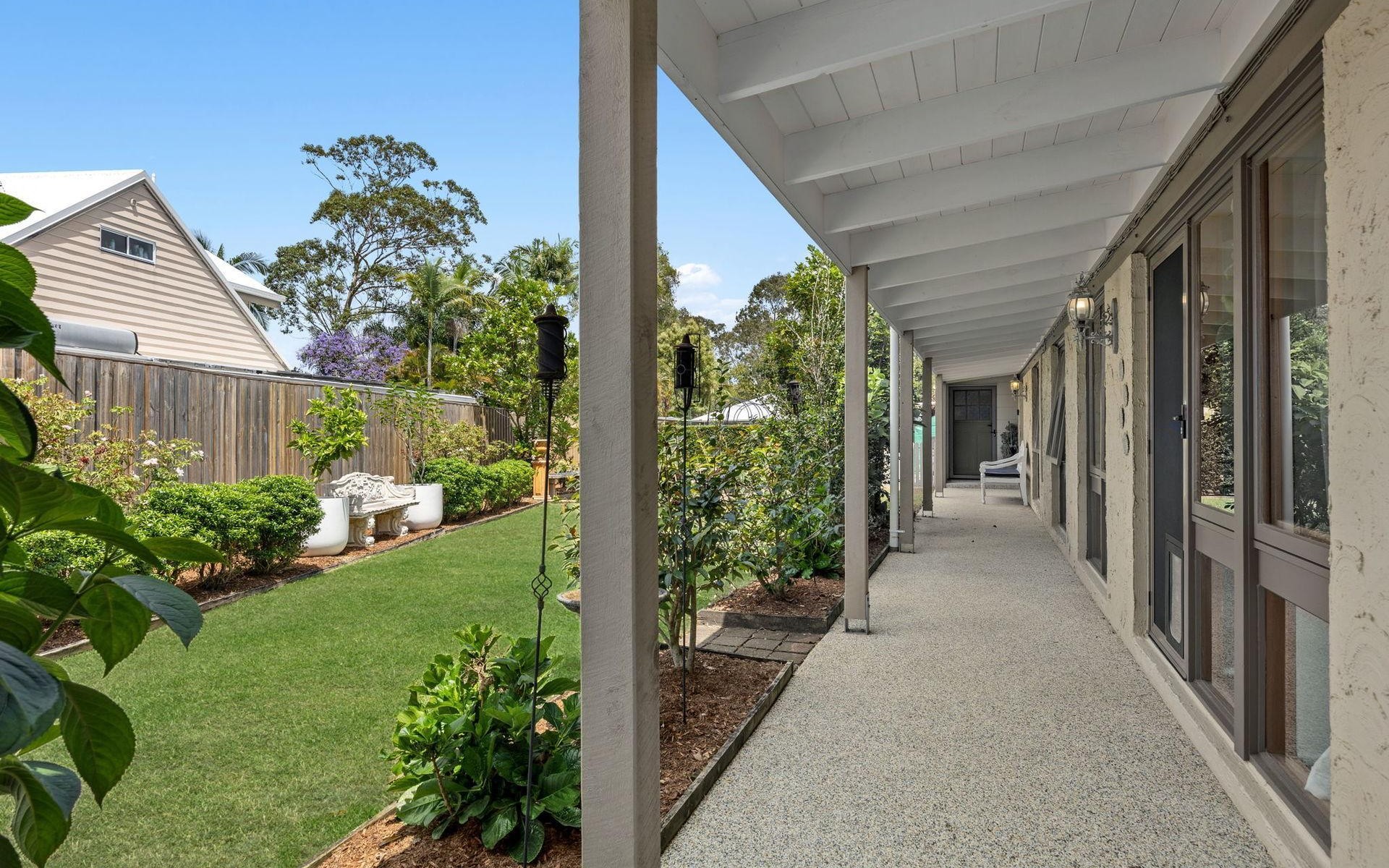 Across approximately 373 square metres, the residence comprises covered wraparound verandah on three sides, five bedrooms, three bathrooms, multiple living areas, elegant designer kitchen with premium appliances and butler's pantry/study, custom-designed kitchenette, separate laundry, and double carport; there is also onsite parking for additional vehicles including boat/caravan.