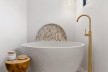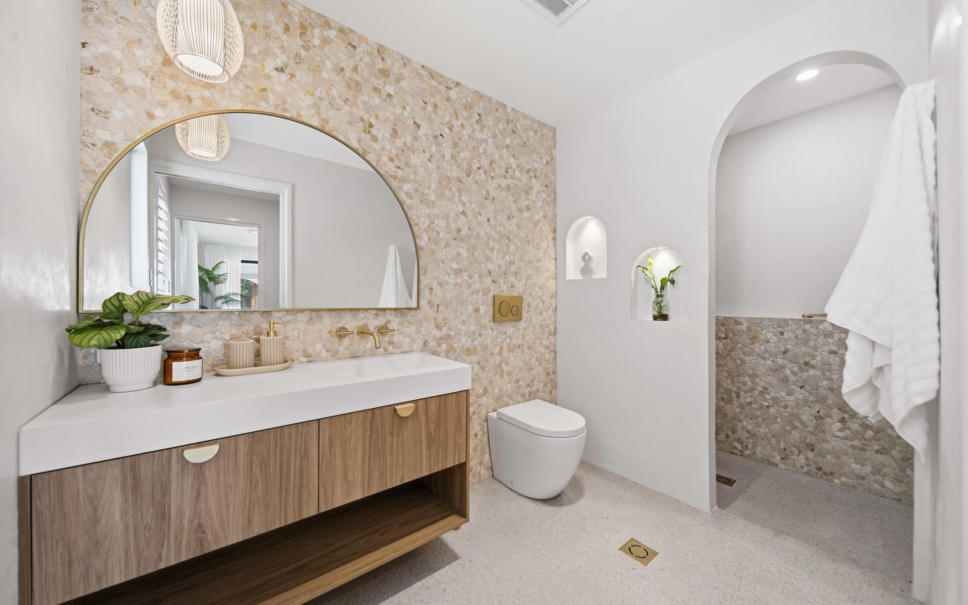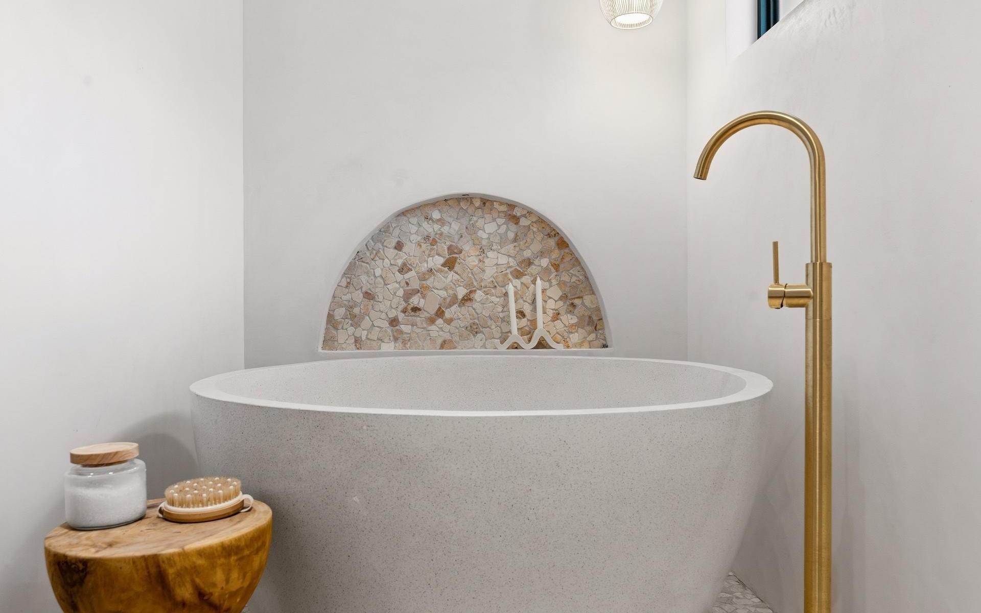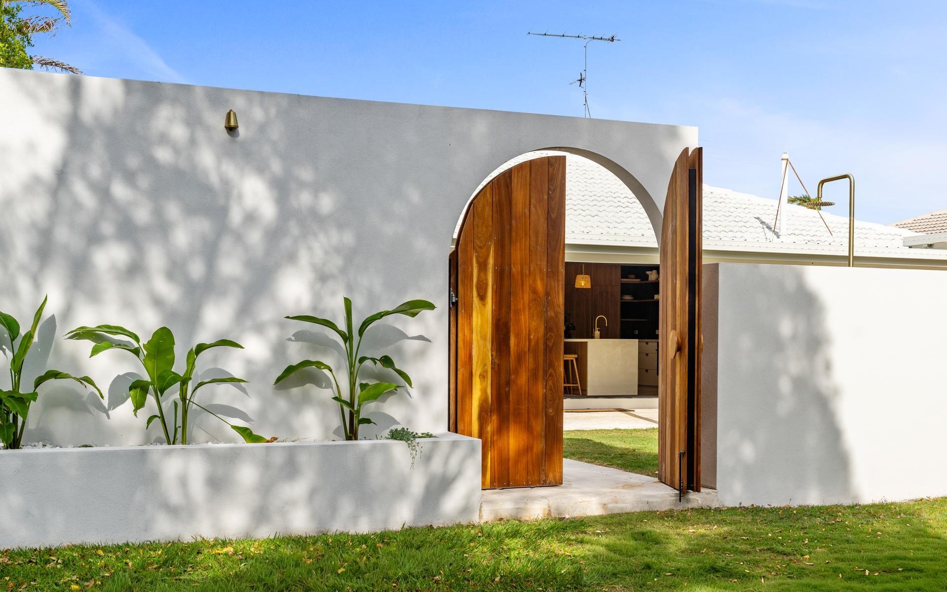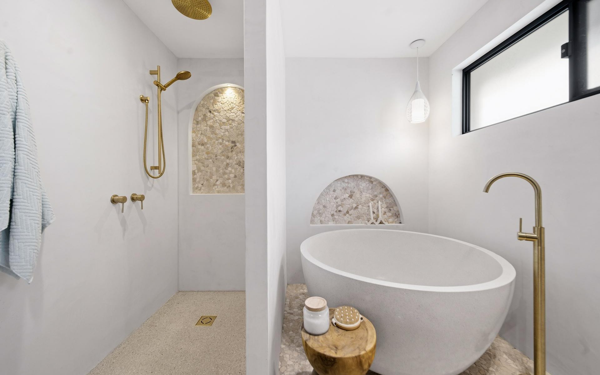 An impressive suite of features including bespoke fixtures and fittings really elevates the wow factor of Casa Palmera; from the circular terrazzo stone bath, brushed brass tapware, abundance of gentle arches and curves, limestone crazy paving outdoors, through to the custom-designed gate and arched entry into the property which truly sets the tone for what lies within.