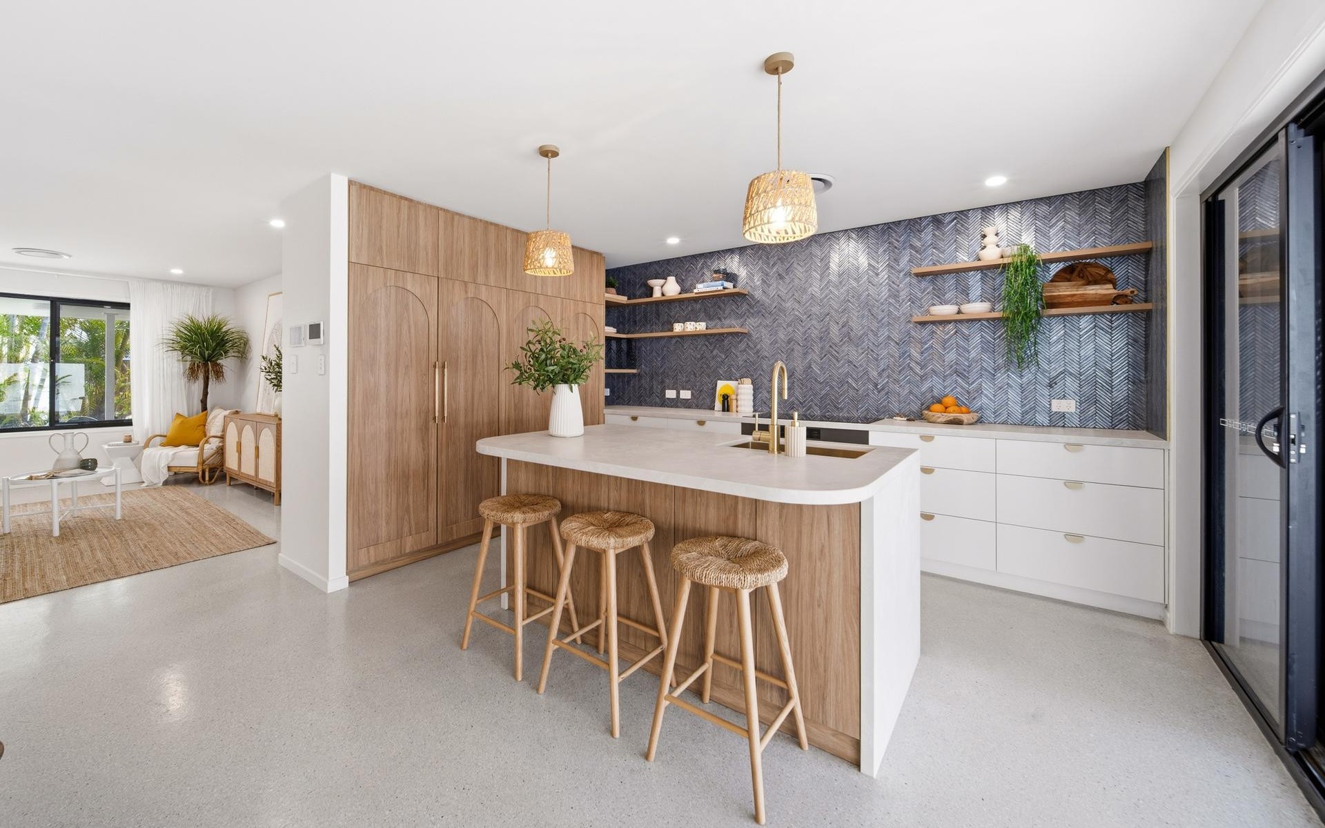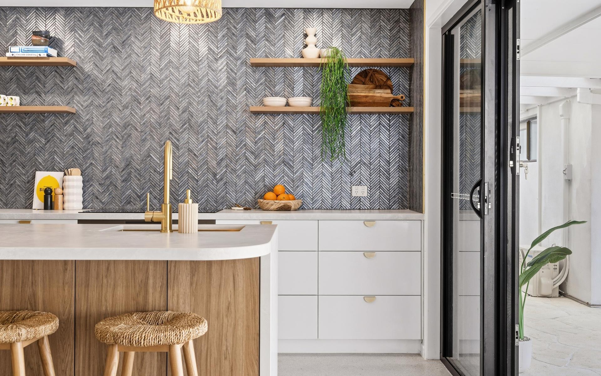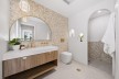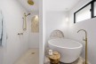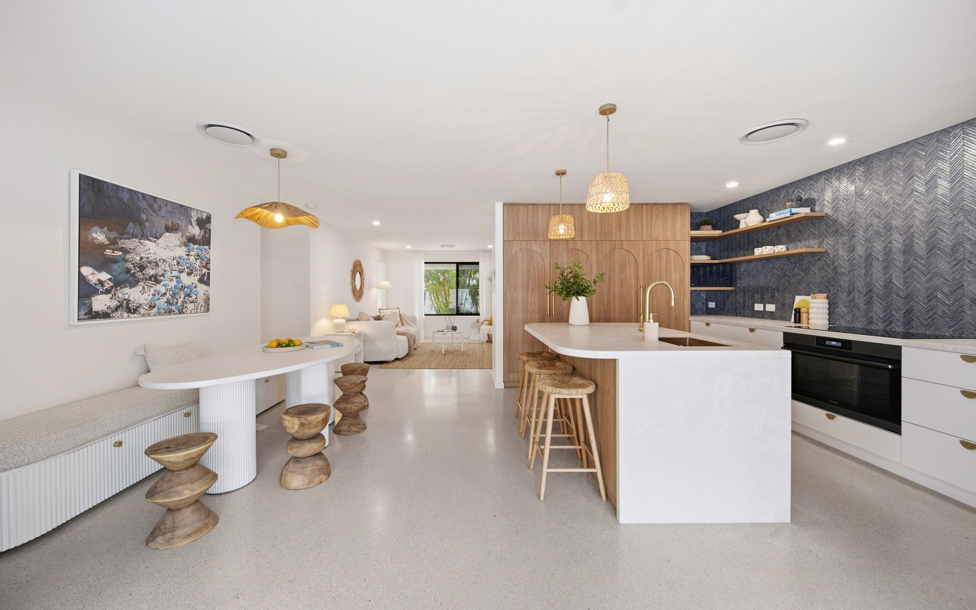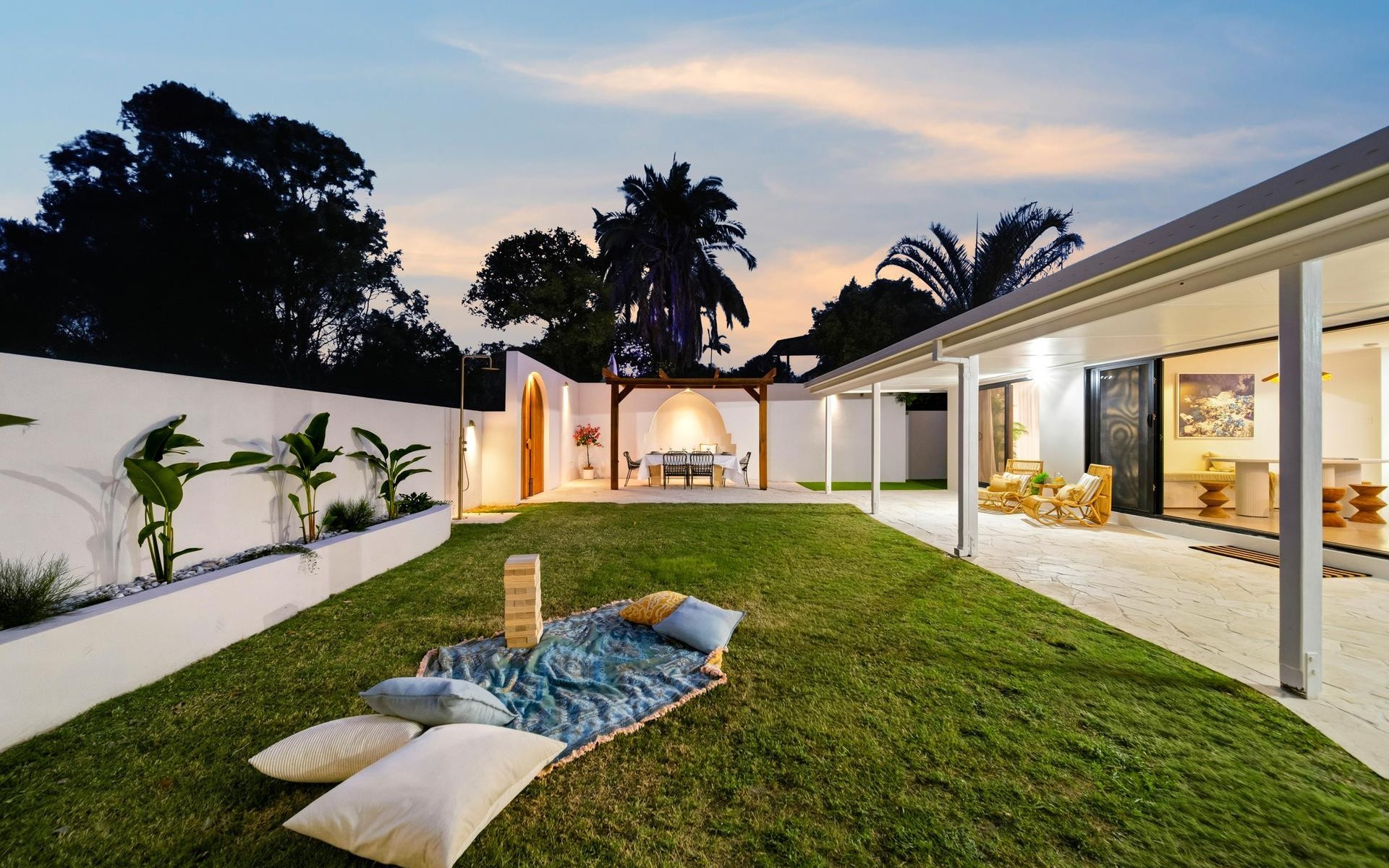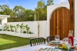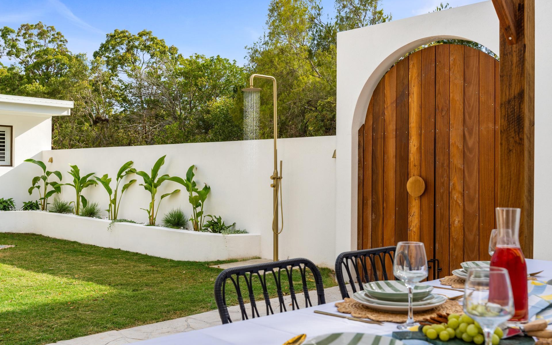 An impressive suite of features including bespoke fixtures and fittings really elevates the wow factor of Casa Palmera; from the circular terrazzo stone bath, brushed brass tapware, abundance of gentle arches and curves, limestone crazy paving outdoors, through to the custom-designed gate and arched entry into the property which truly sets the tone for what lies within.
