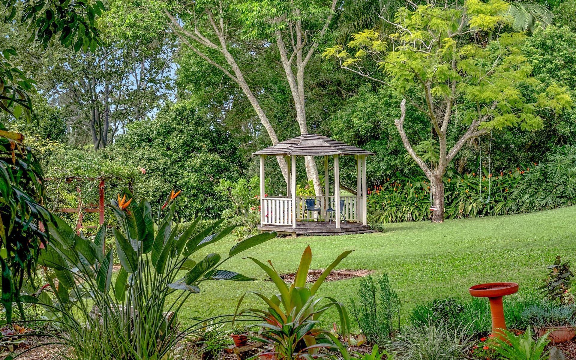Infrastructure on the property includes bitumen driveway with circular turning area alongside house, full fencing, solar-powered gate at entry, garden structures such as gazebo and arbor with leafy canopy, and 3-phase powered 5-bay shed with 3 x roller doors and 2 x open bays. All power, services and telecommunications services to home are underground and in place.
