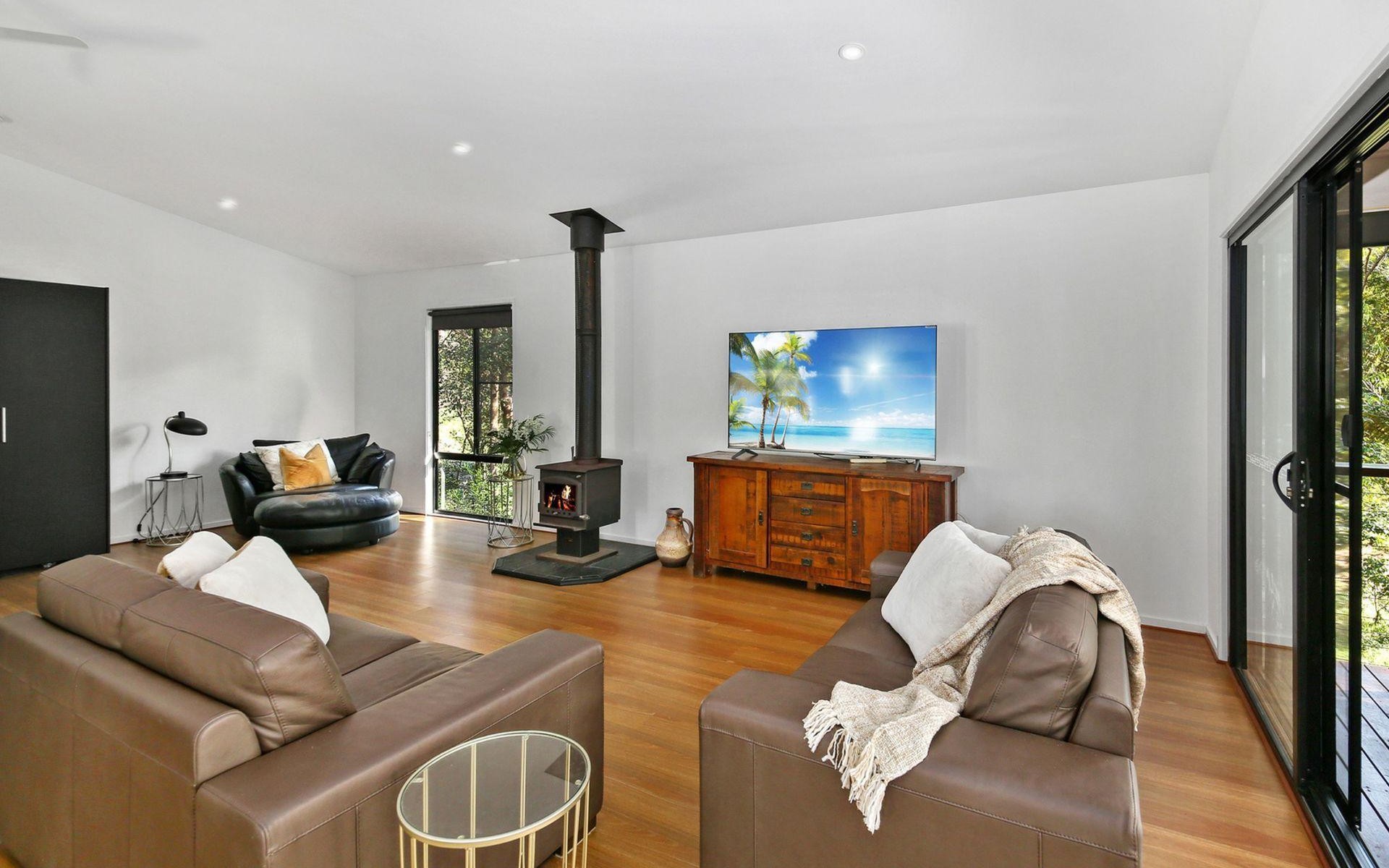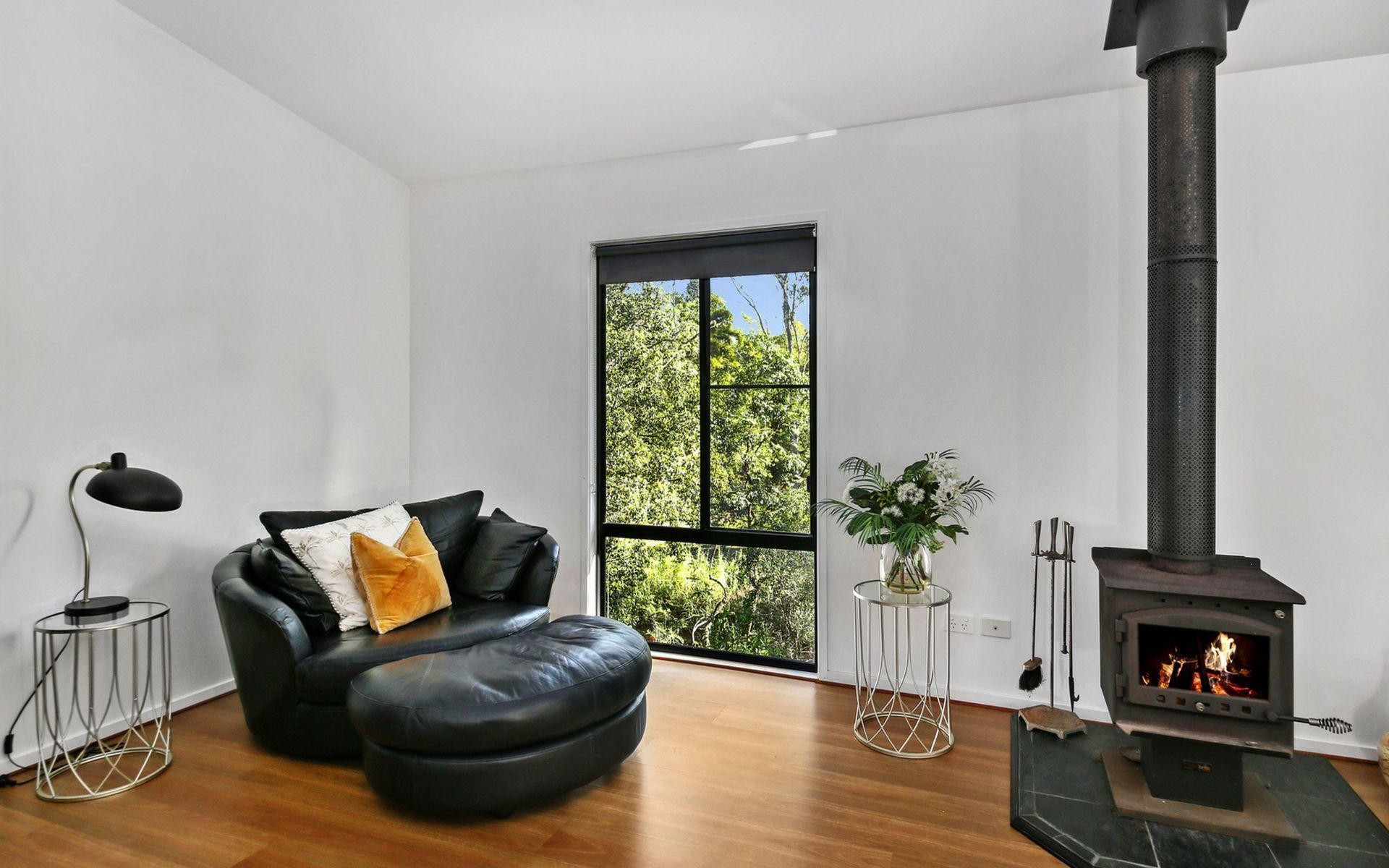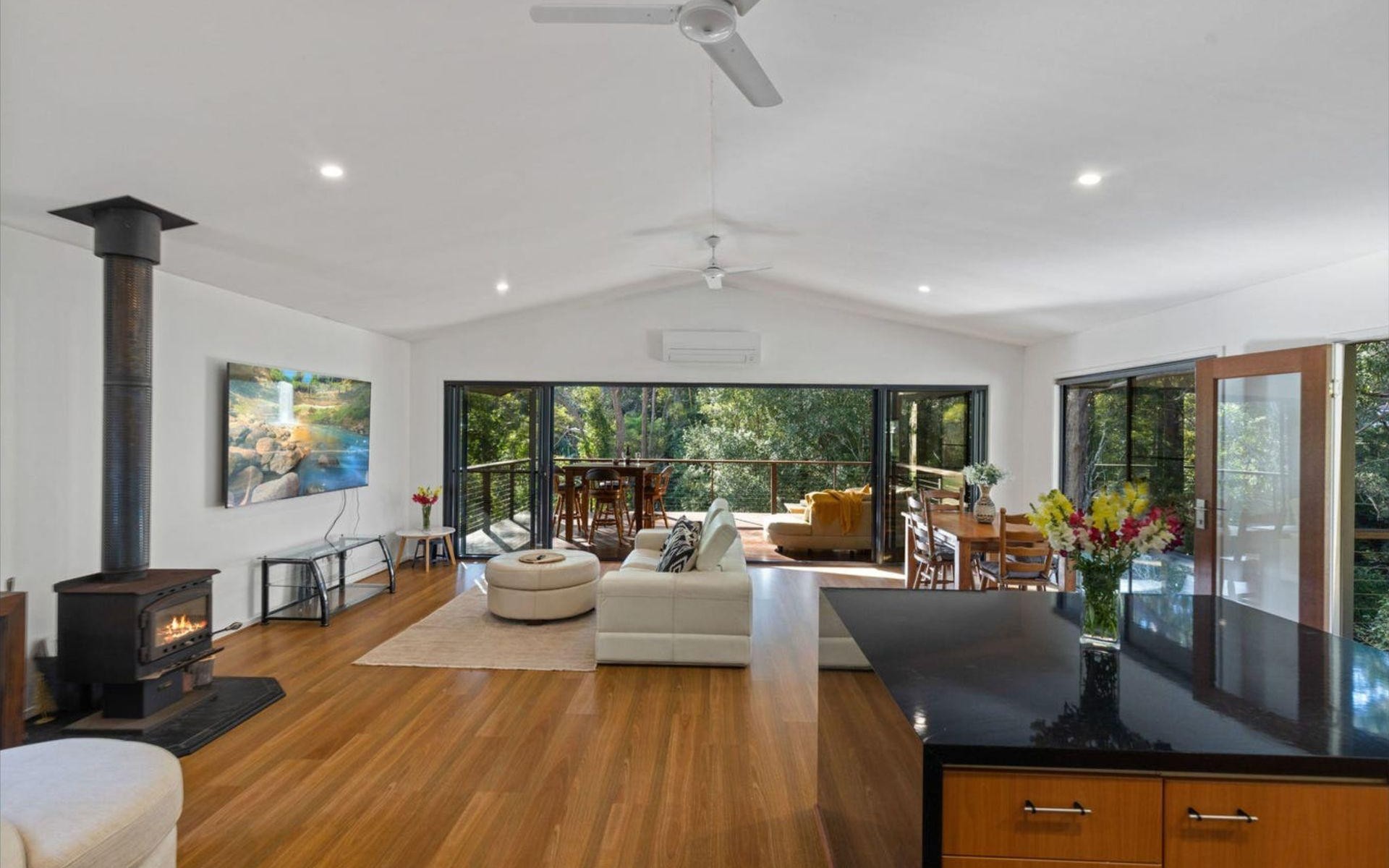 The main residence is perfectly positioned at an elevated and ultra-private site on the property: comprising three bedrooms, two bathrooms, modern light-filled kitchen, open plan living with fireplace, wraparound deck, separate laundry, and four vehicle-carport.