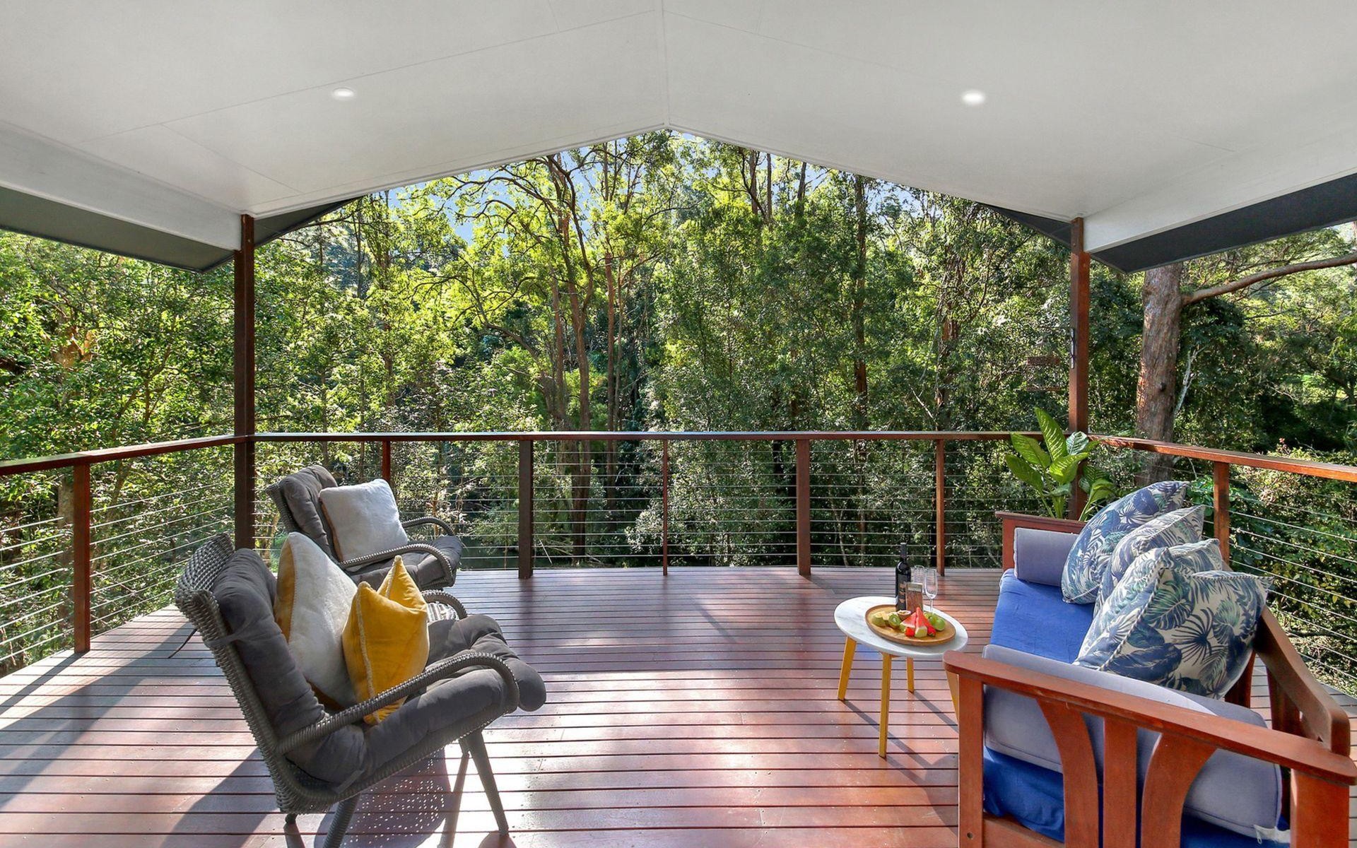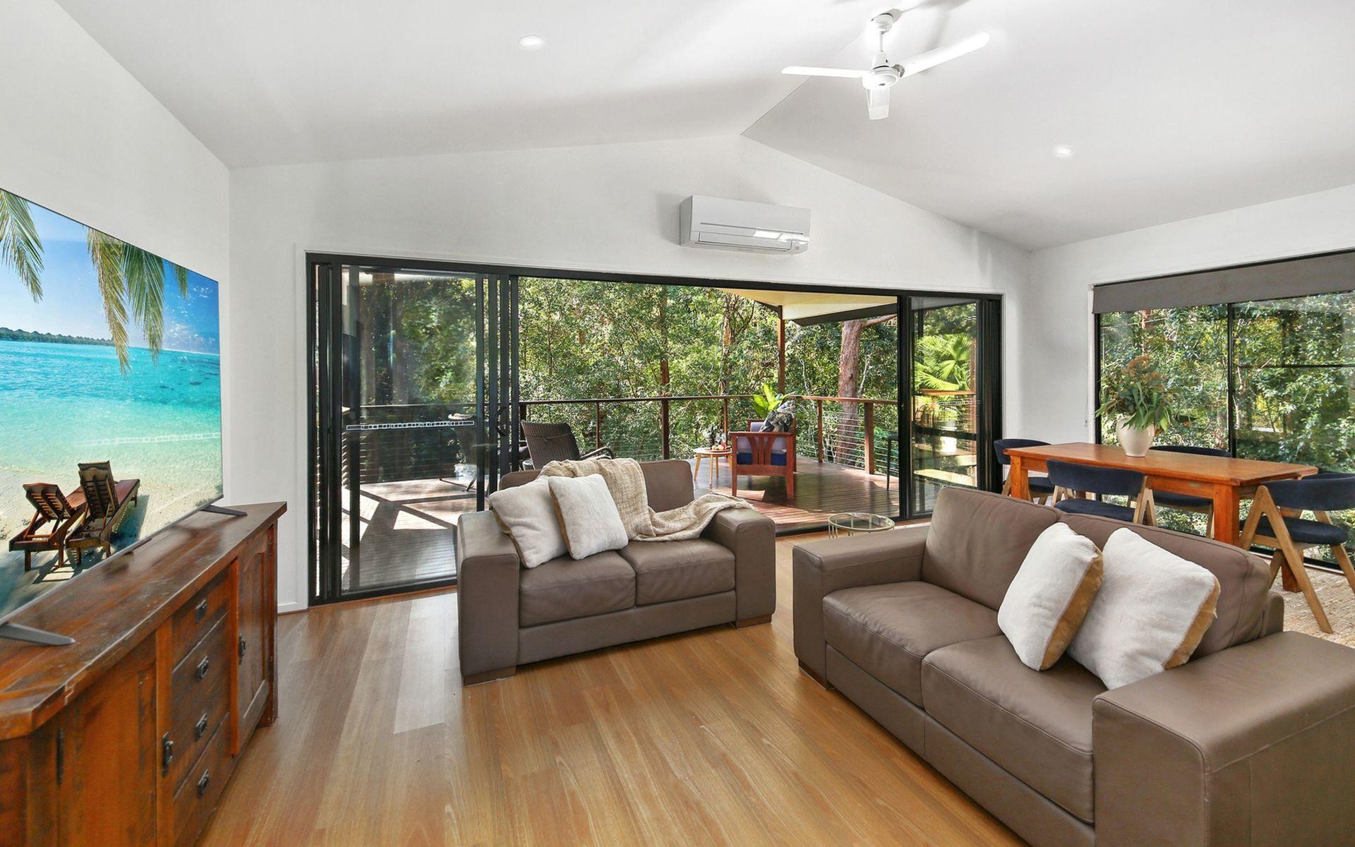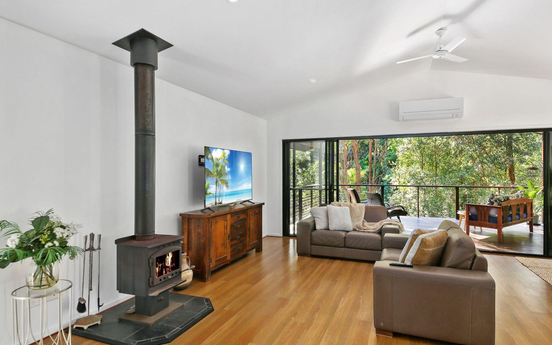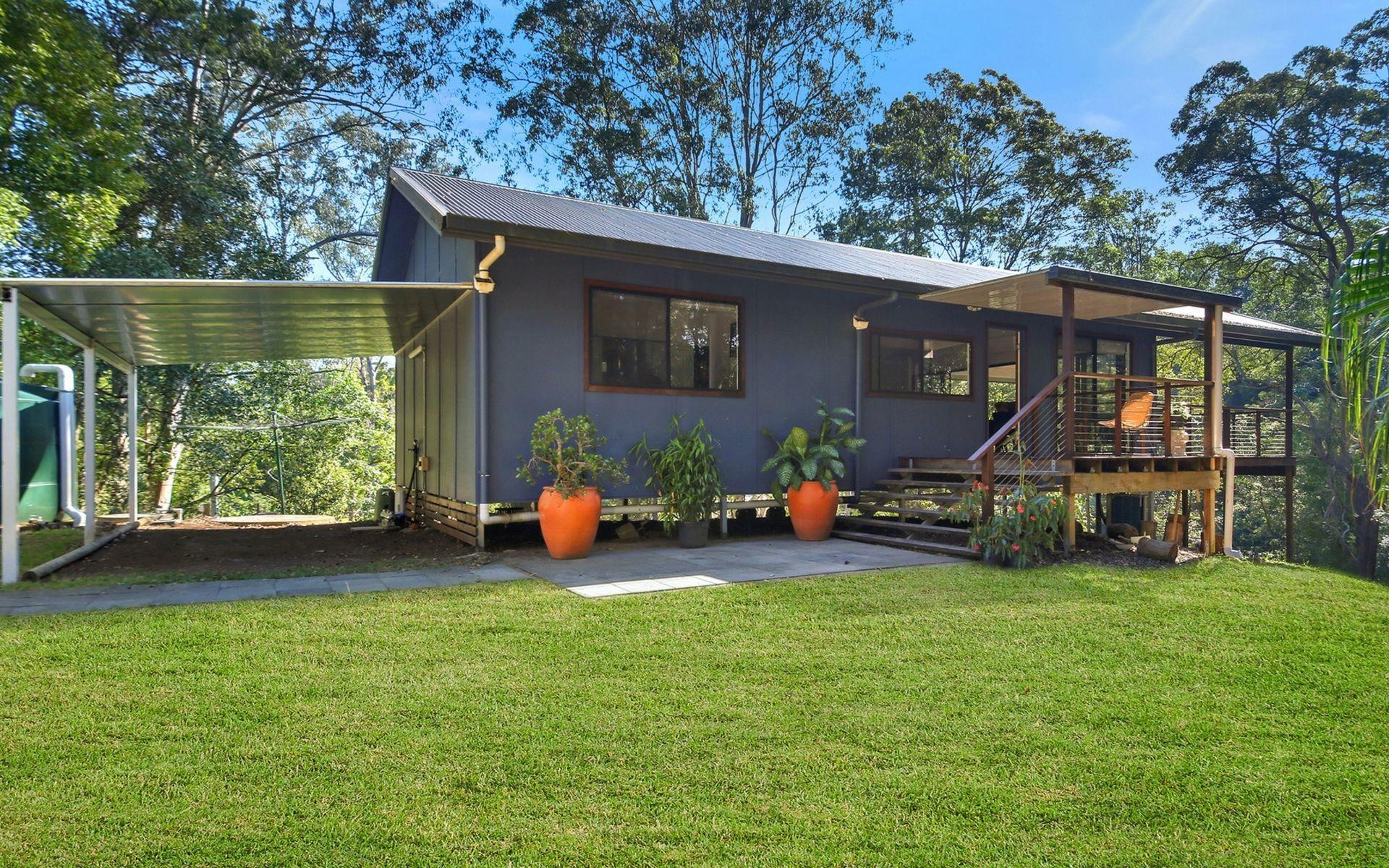 The second (fully approved) air-conditioned dwelling is a modern 7 yr old, high-set design with one bedroom, fully tiled ensuite, open plan living with fireplace, kitchen, elevated north-facing deck showcasing a delightful, treed outlook overlooking Eudlo Creek, plus double carport. This could be ideal for intergenerational living, rental income, or guest accommodation.